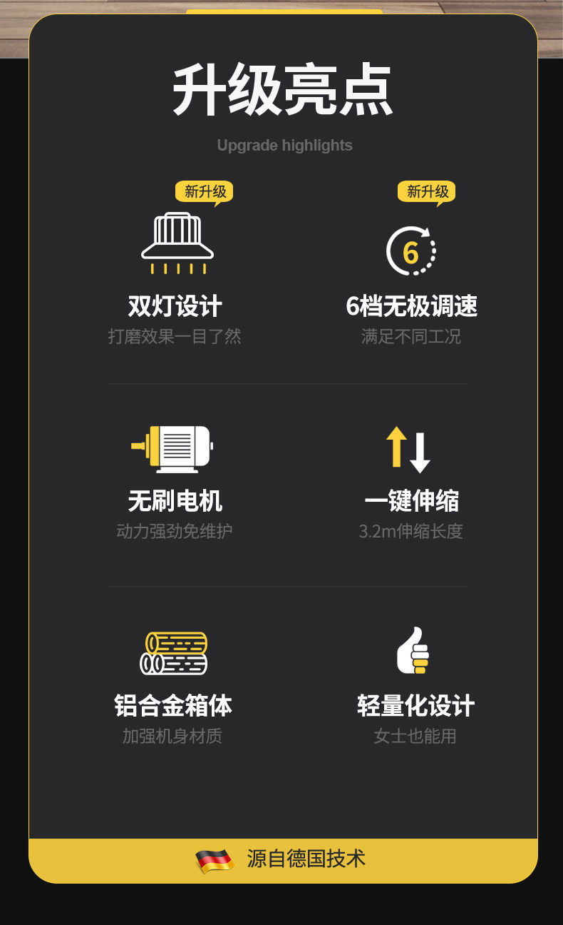 - Brushless digital display self-vacuuming 3.2 meters (ceiling) 6 sandpaper