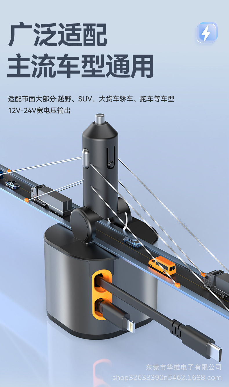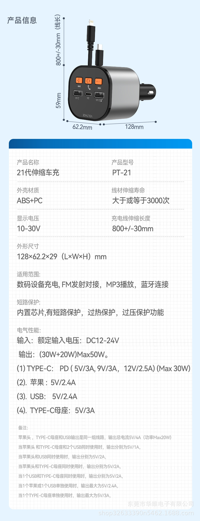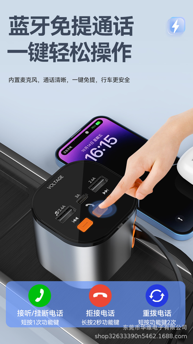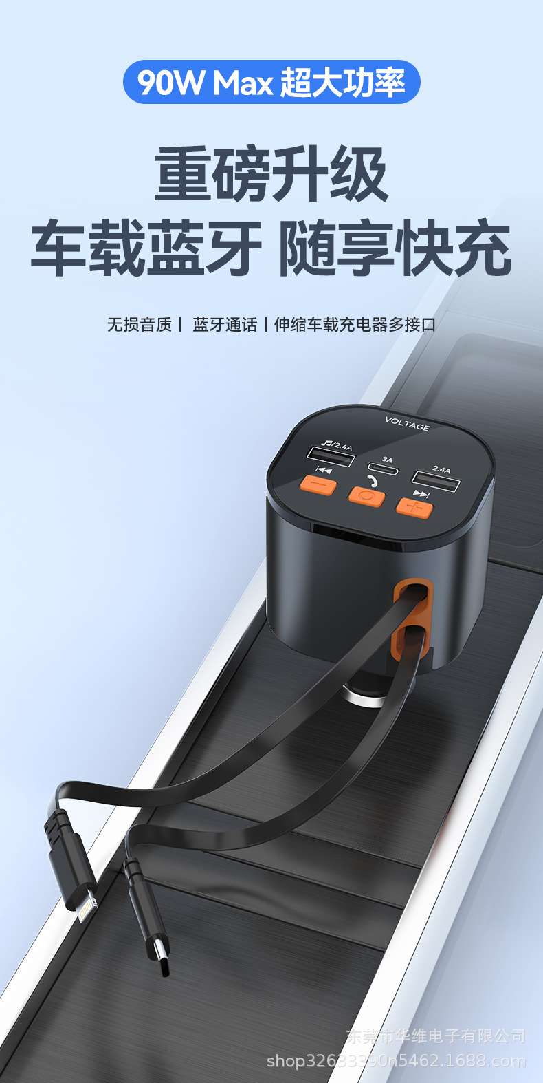 - PD30W car charger with Bluetooth radio function: retractable line Lightning TYPE-C