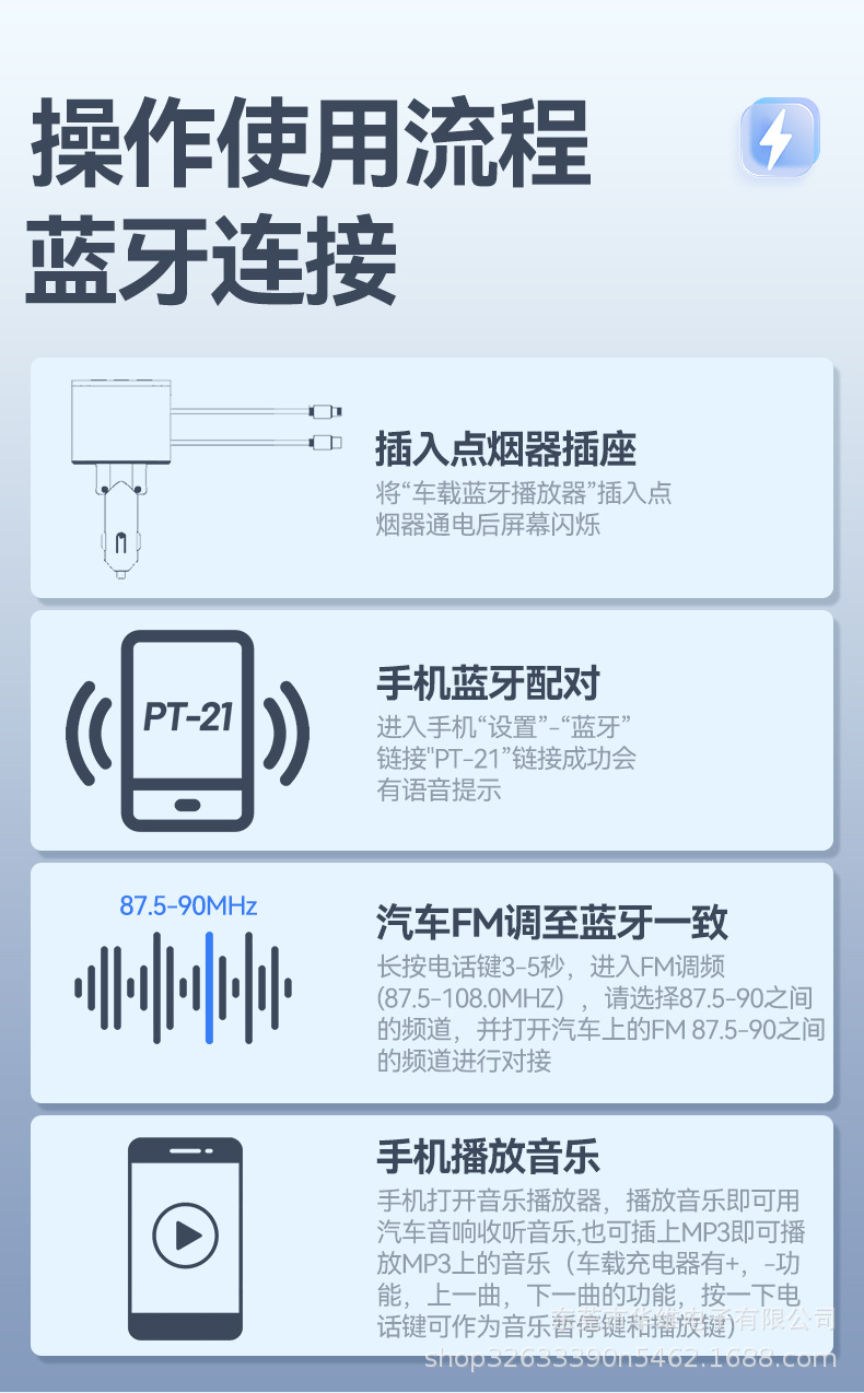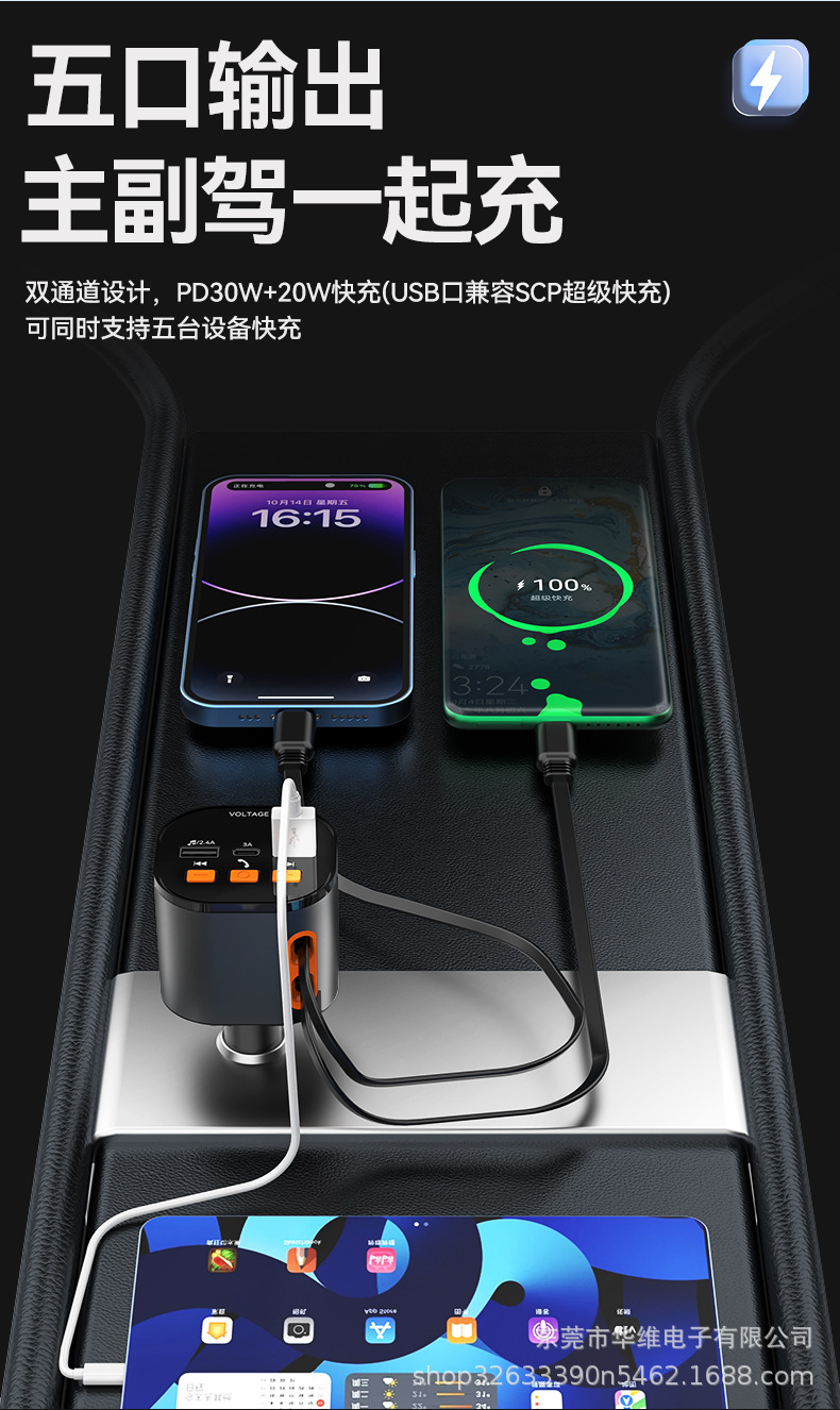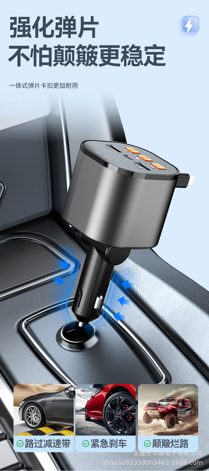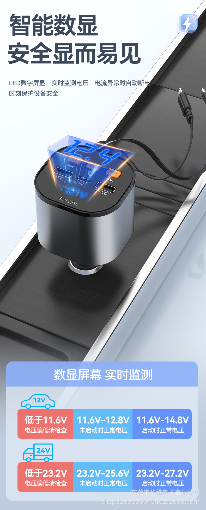 - PD30W car charger with Bluetooth radio function: retractable line Lightning TYPE-C