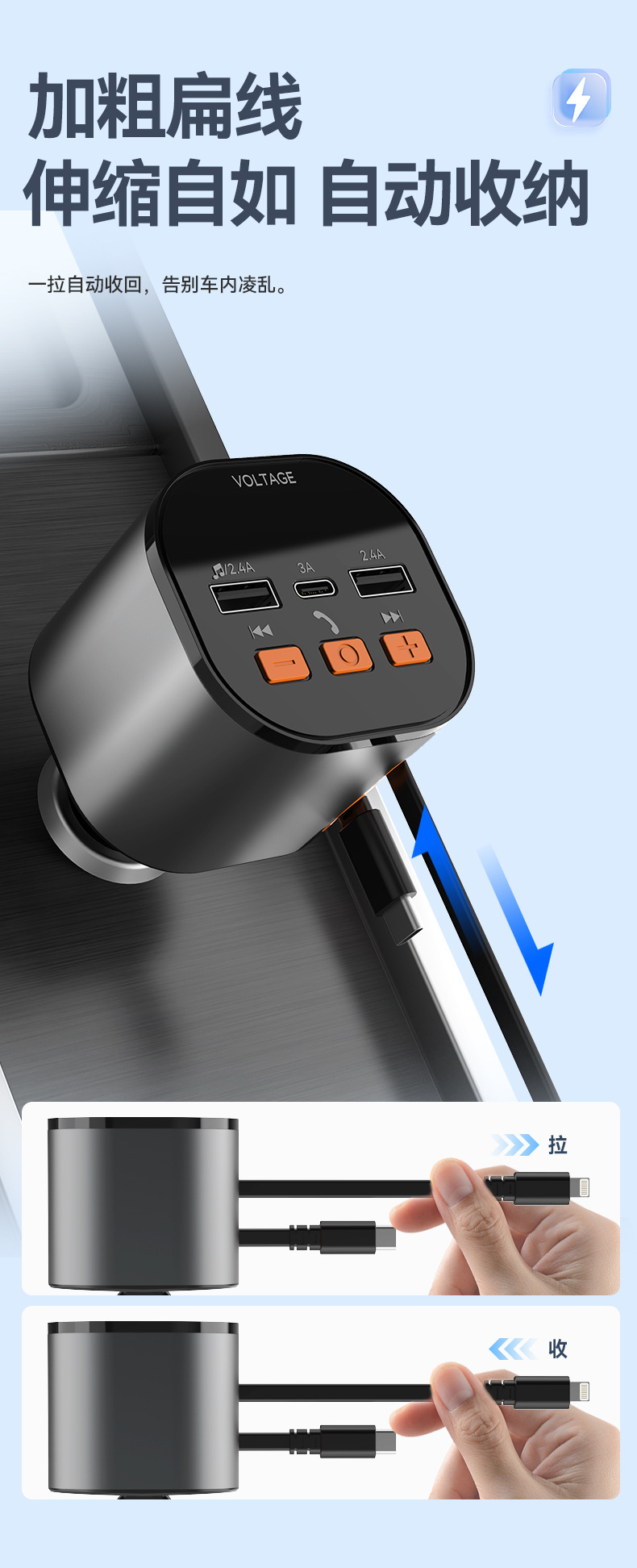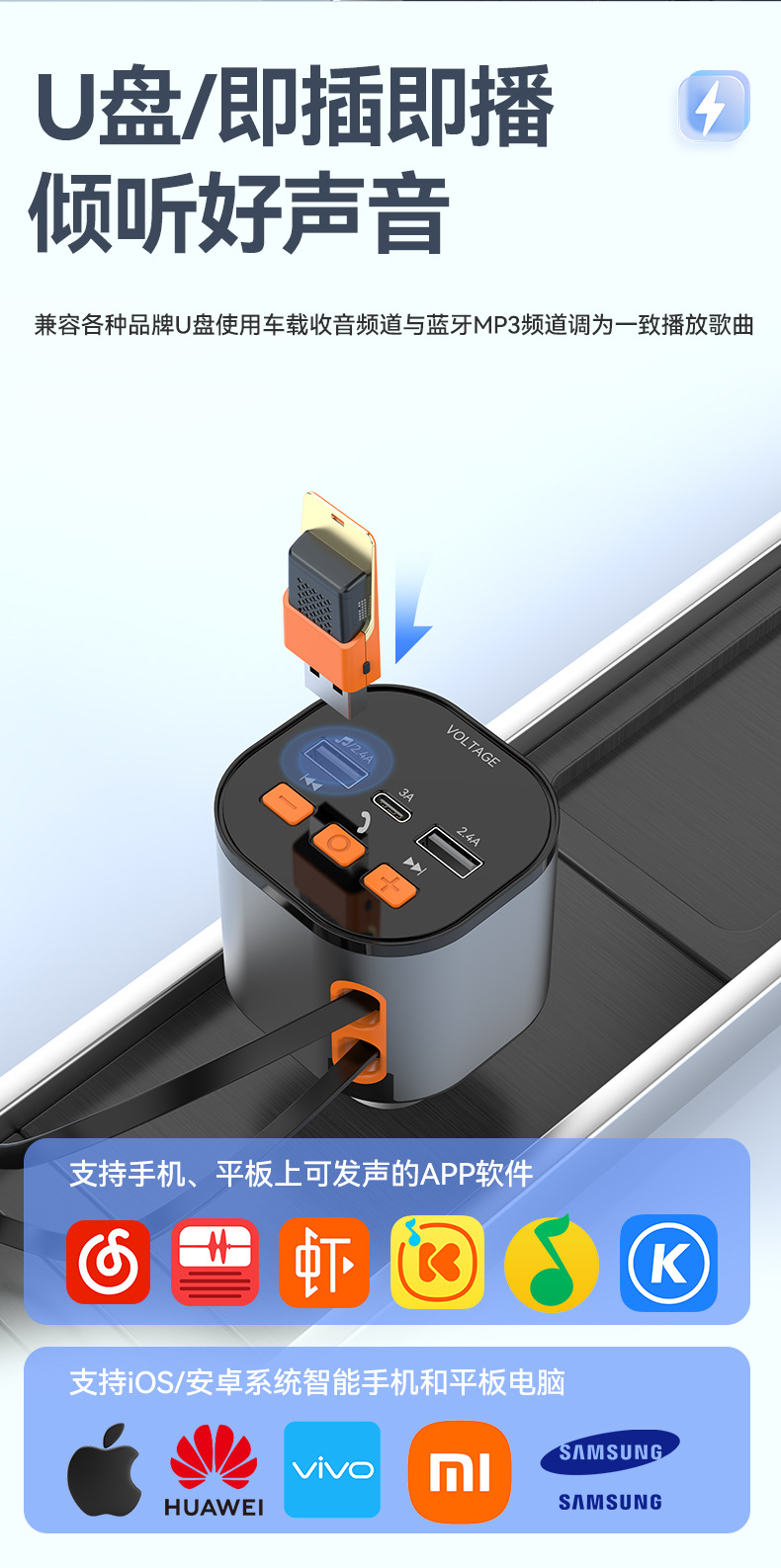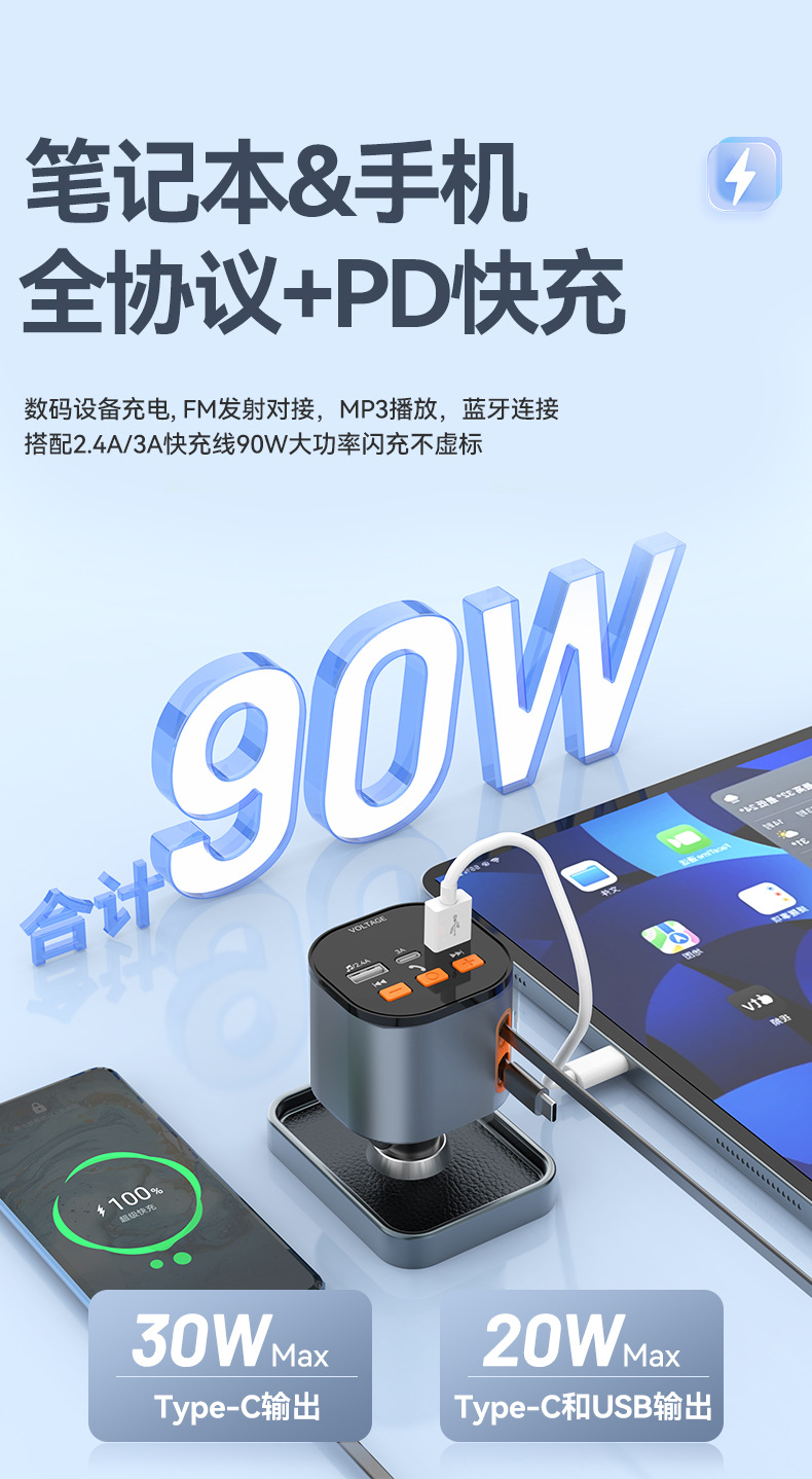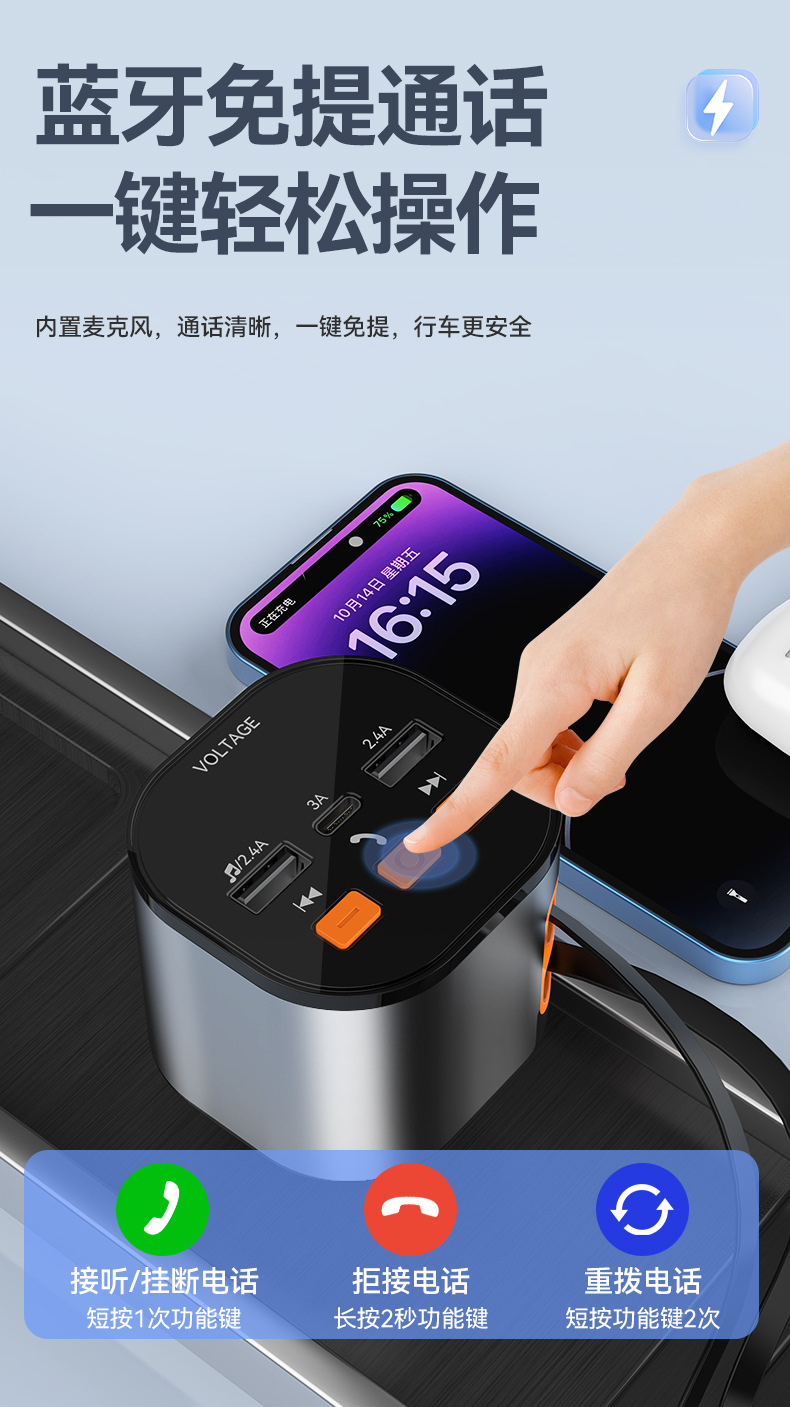 Multi function charger car bluetooth mp3 player lossless call QC3.0 fast charge telescopic line PD car charger