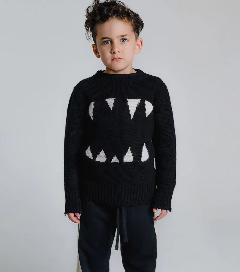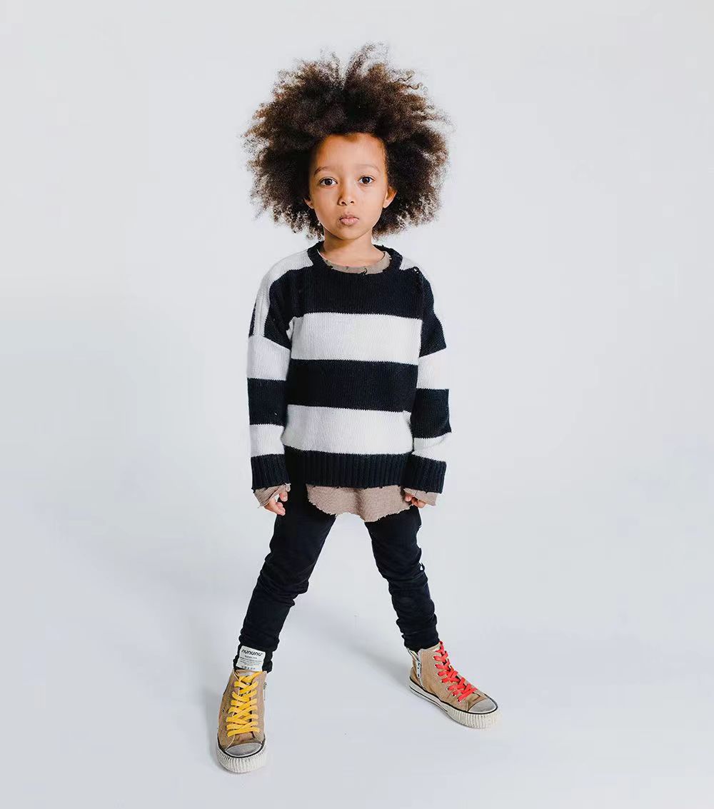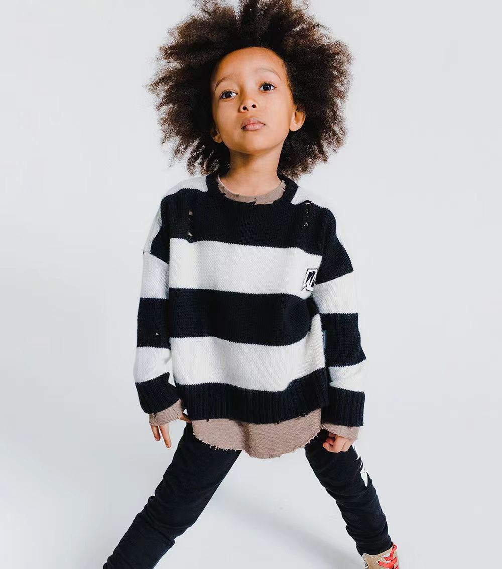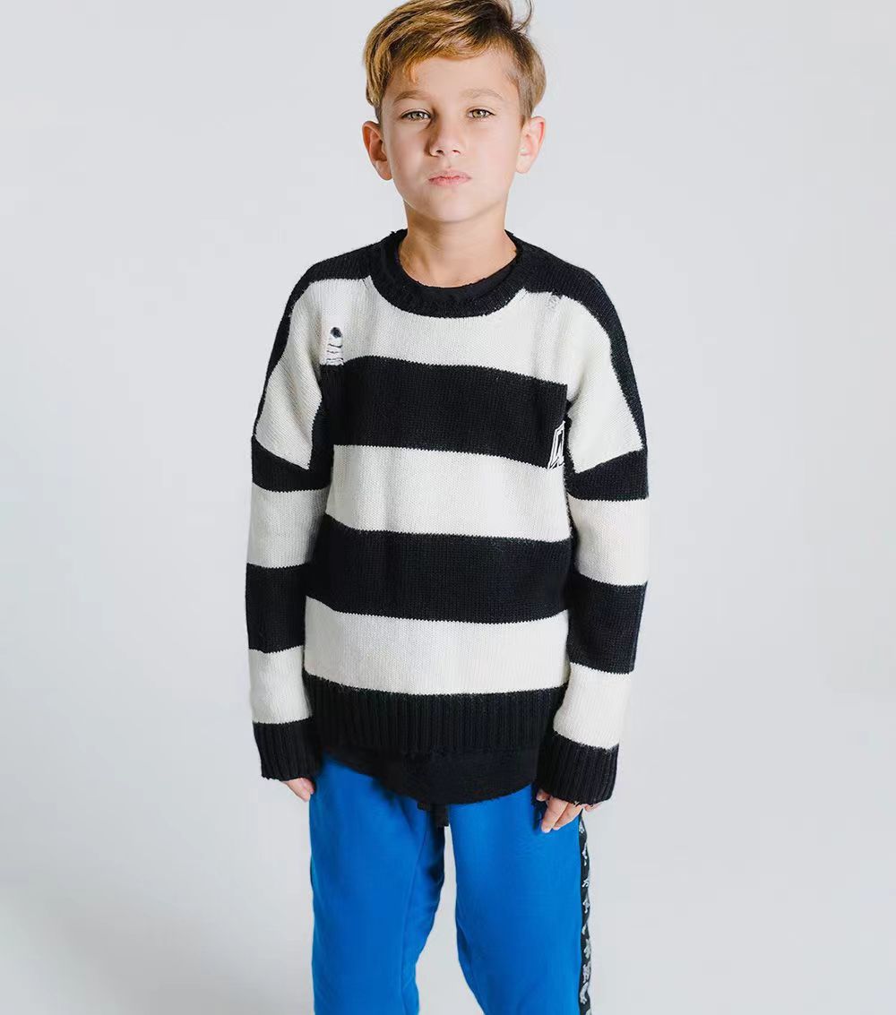 NUU same autumn and winter children s warm round neck pullover sweater retro black and white striped plaid sweater in stock wholesale