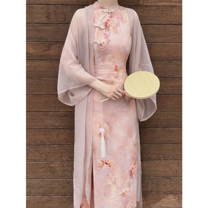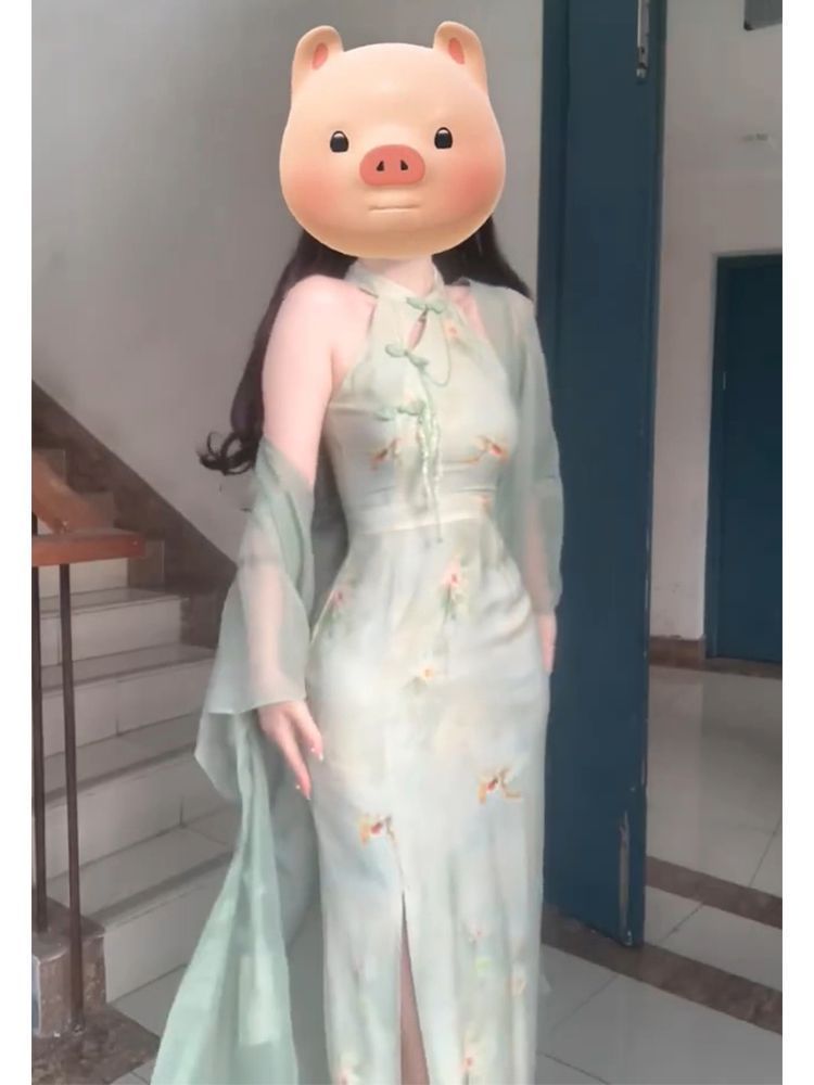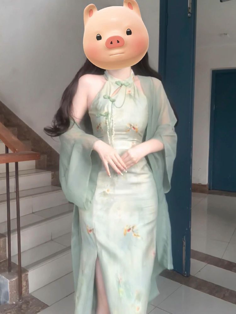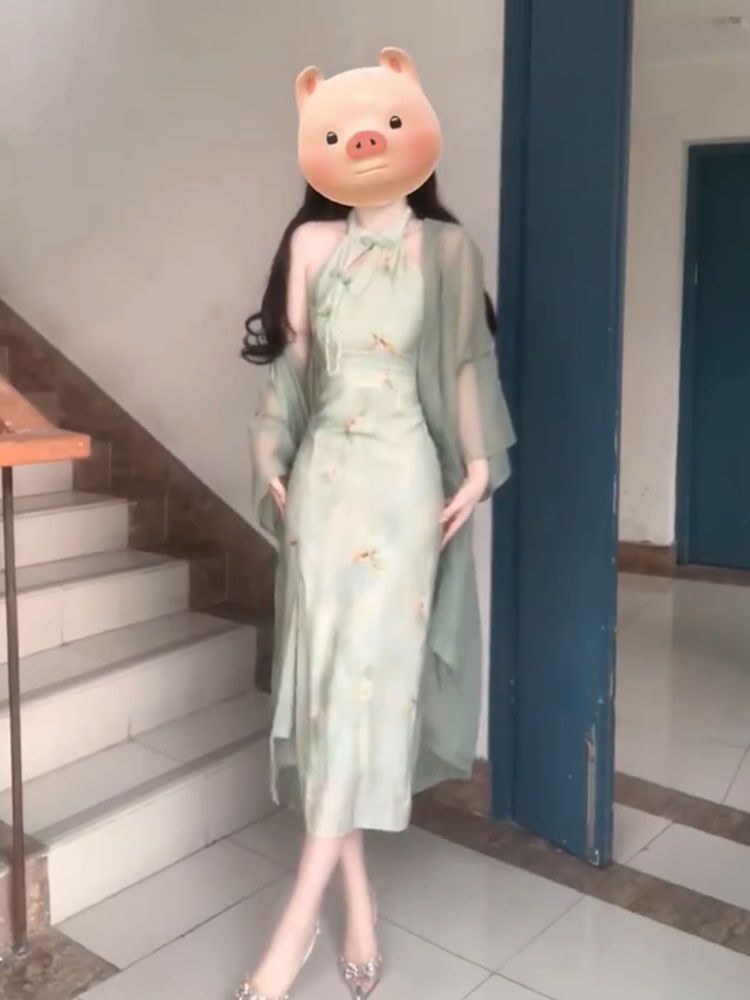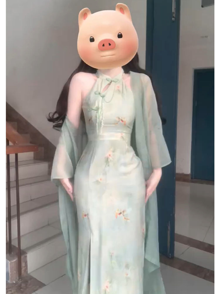 New Chinese Style Light National Style Improved Cheongsam 2024 Summer New Niche Slim fit Green Neck dress Two piece Set