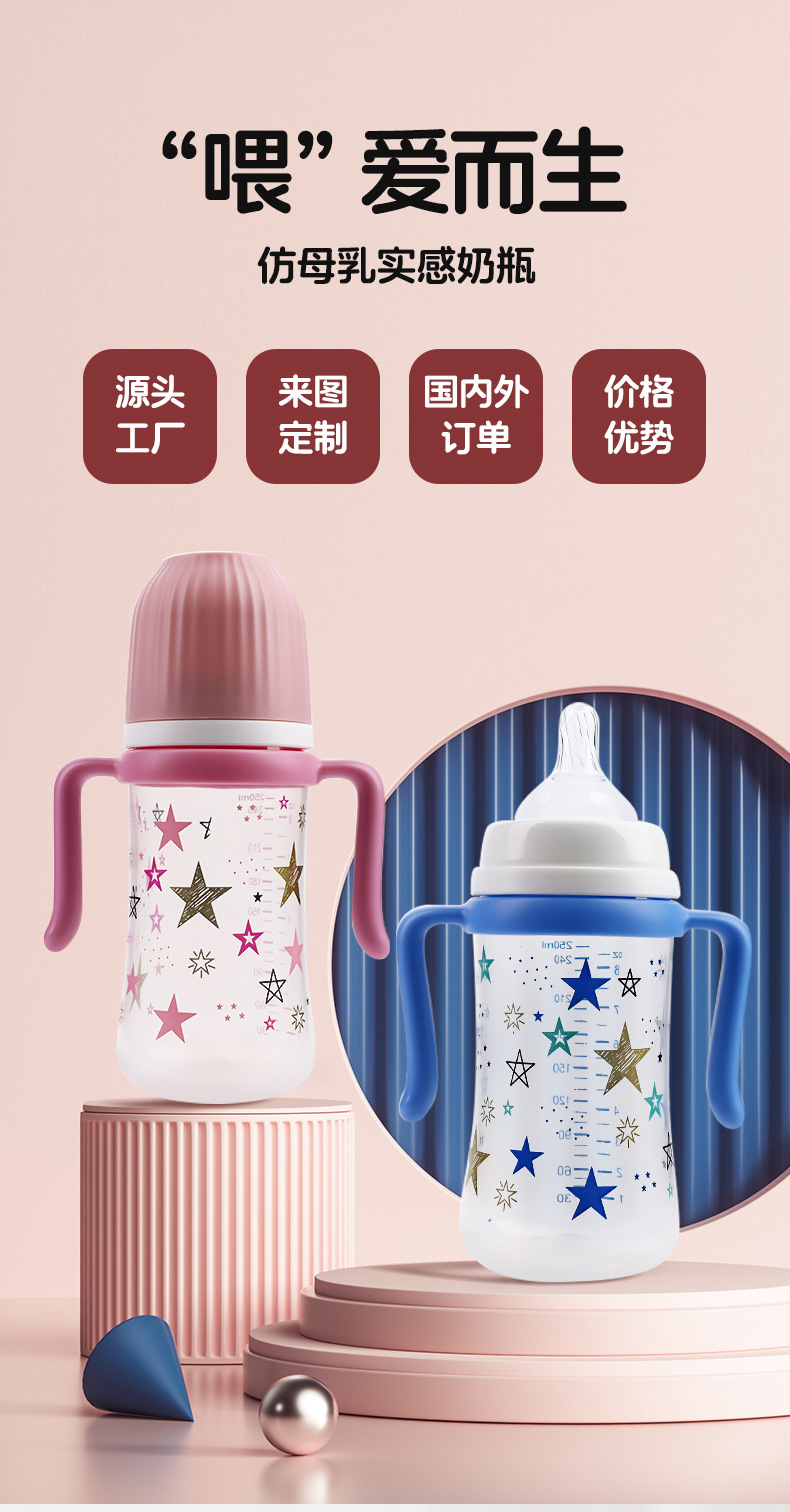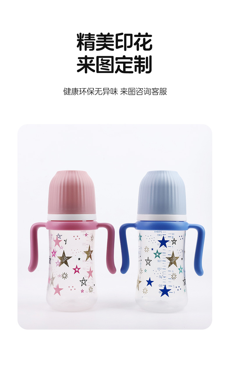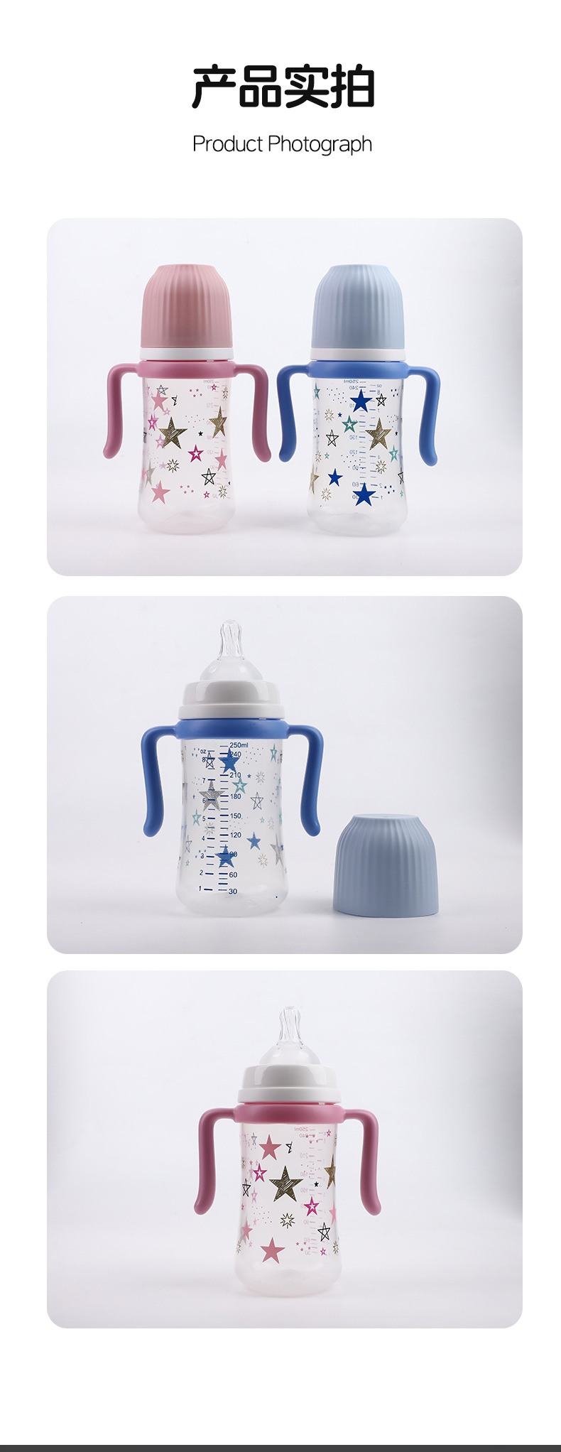 Printed baby bottle food grade silicone nipple with handle anti drop anti choking environmental protection PP mother and baby products factory wholesale