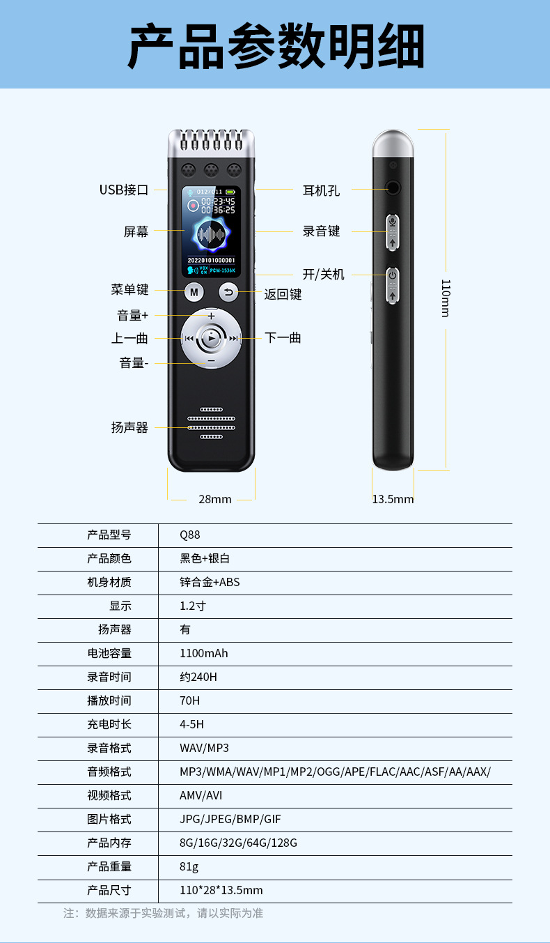Q88 HD Noise Reduction Recording Pen Voice Control Recording mp3 Conference Interview Extra Long Tape External Professional Recorder
