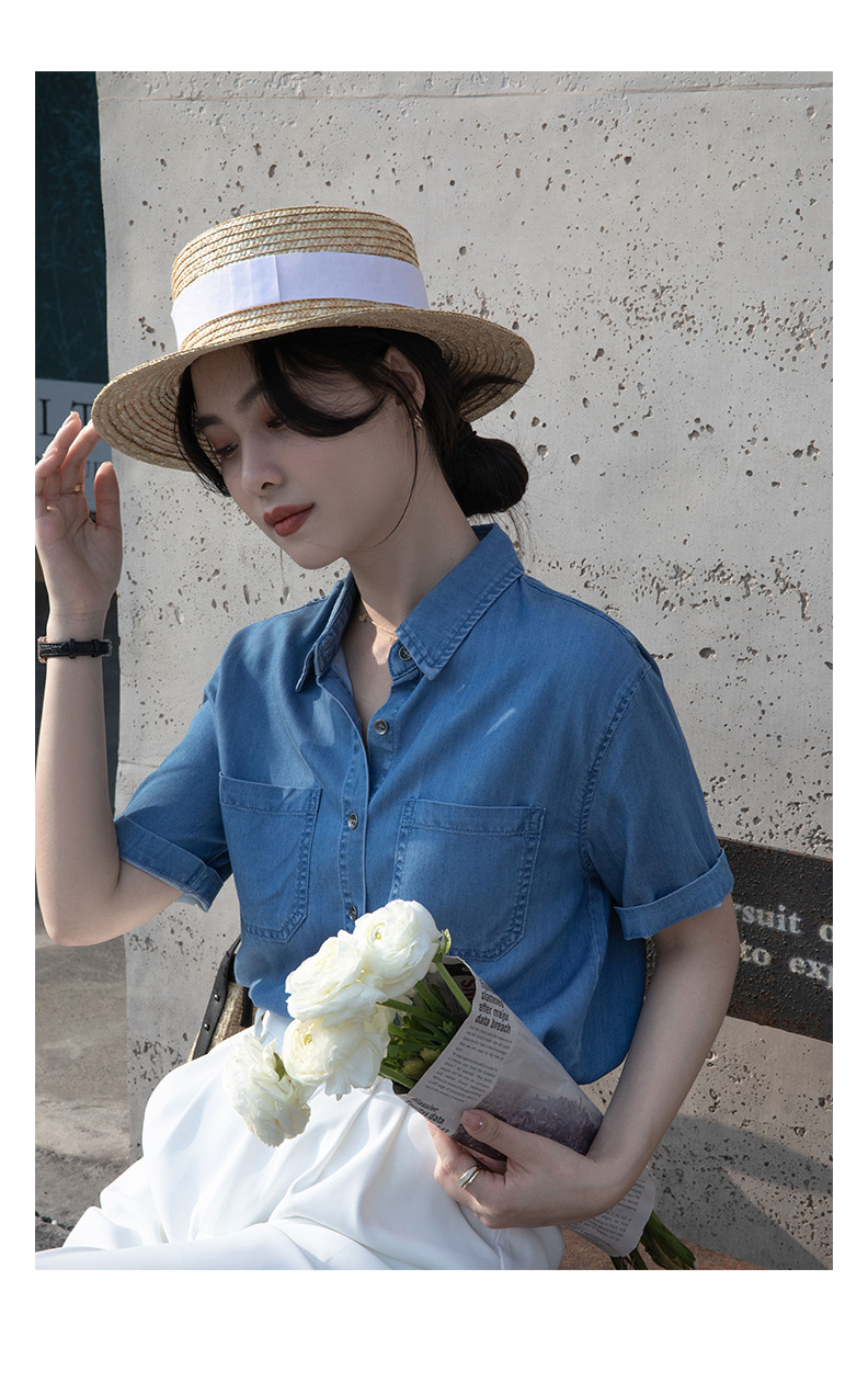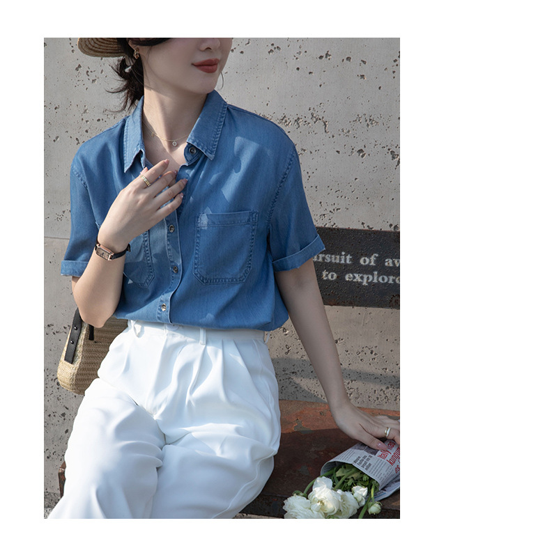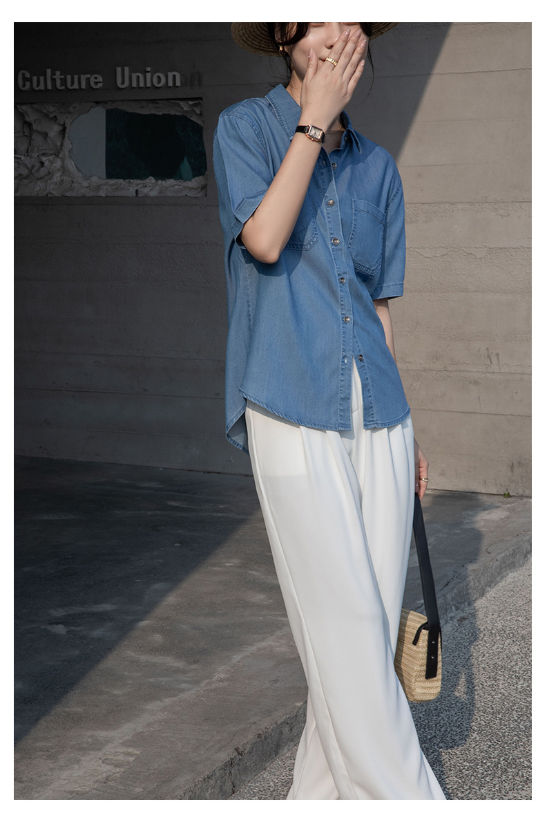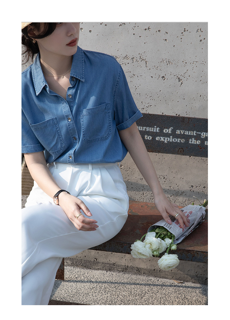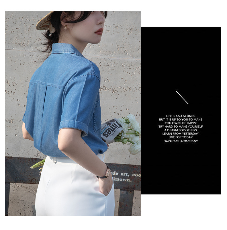 Real Tencel Denim Shirt Women s Short sleeved Top Spring and Summer 2024 New Retro Fashion All match Blue Shirt Women