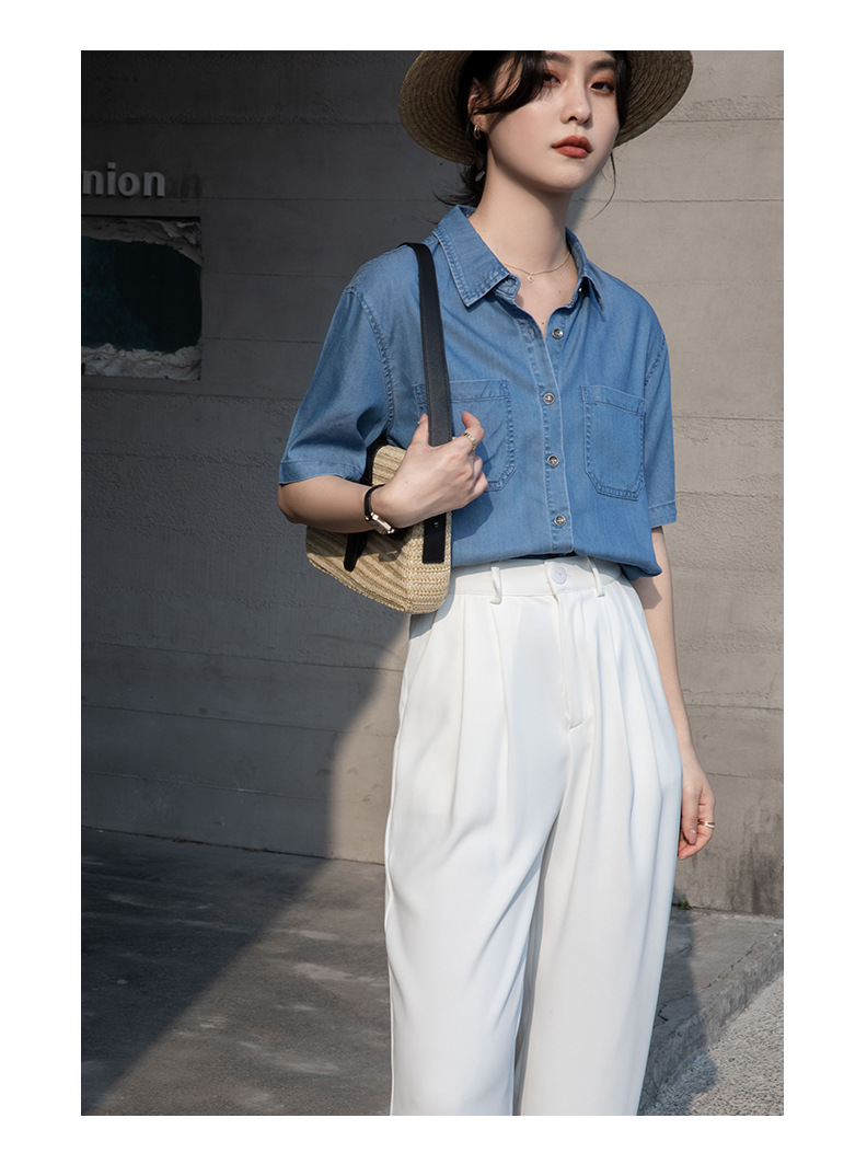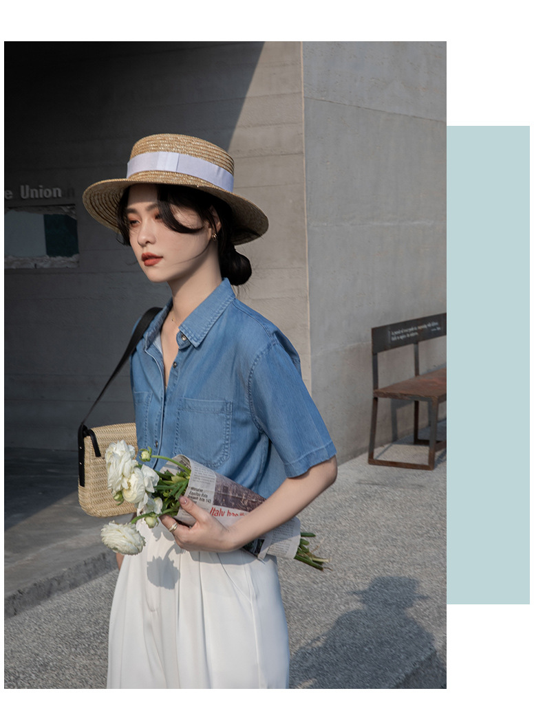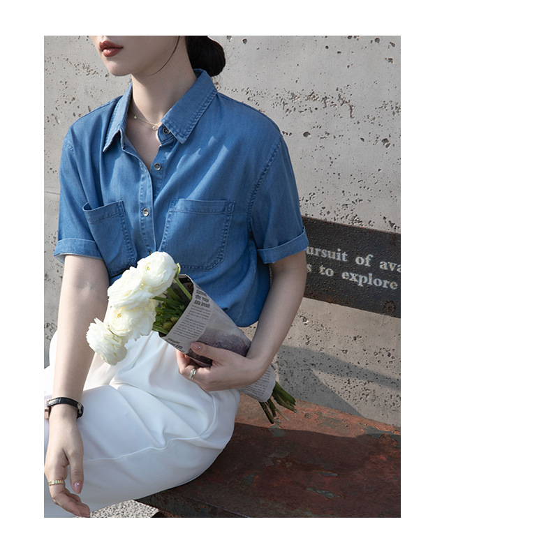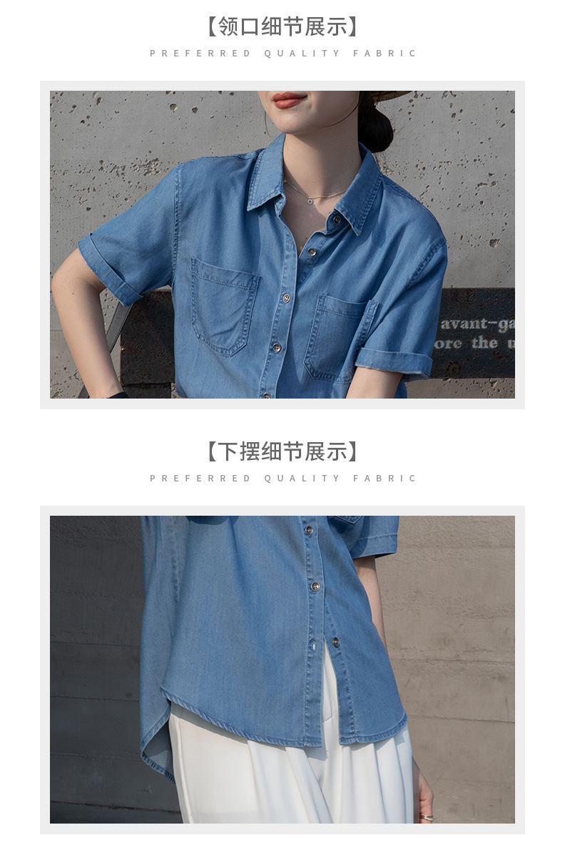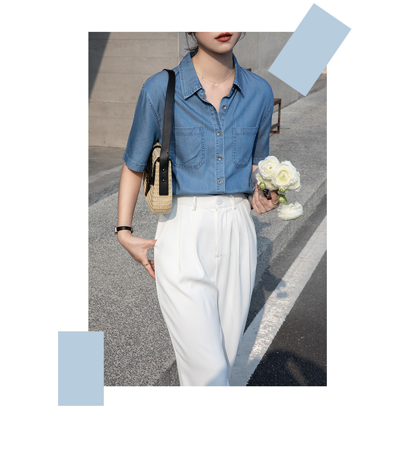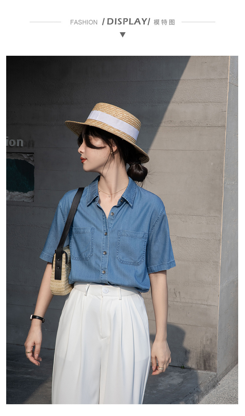 Real Tencel Denim Shirt Women s Short sleeved Top Spring and Summer 2024 New Retro Fashion All match Blue Shirt Women