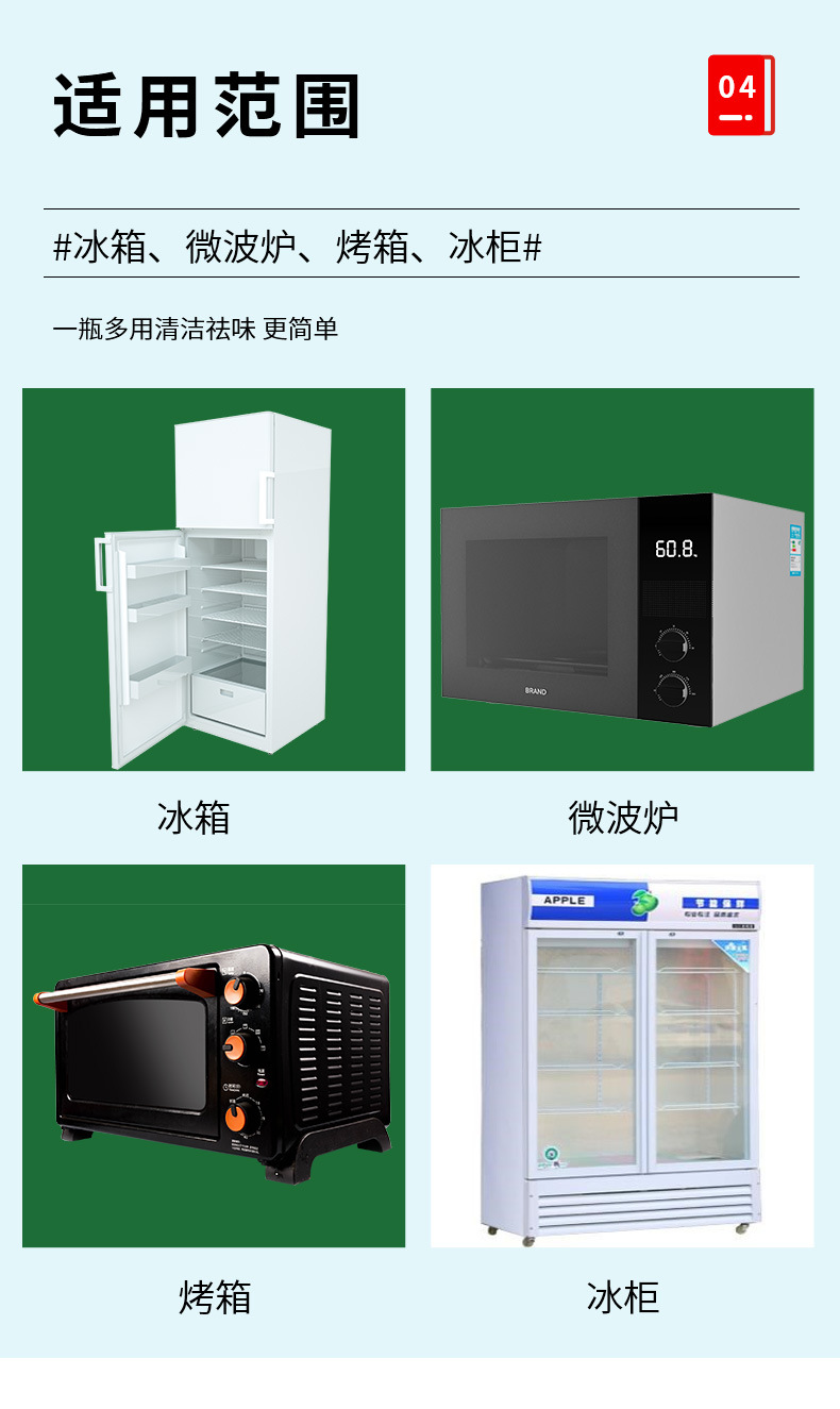 Refrigerator deodorant deodorant cleaning agent cabinet freezer decontamination mildew removing odor induction cooker oven microwave oven