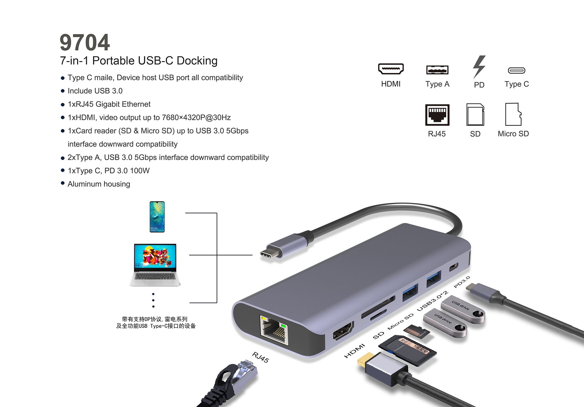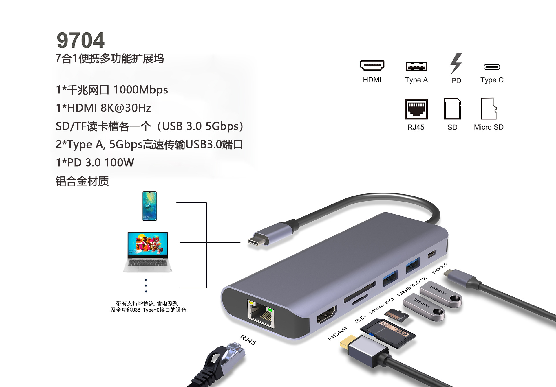 SOURCE Factory usbC seven in one hub expansion dock HDMI8K SD TF3.0 dual drive letter Gigabit RJ network port