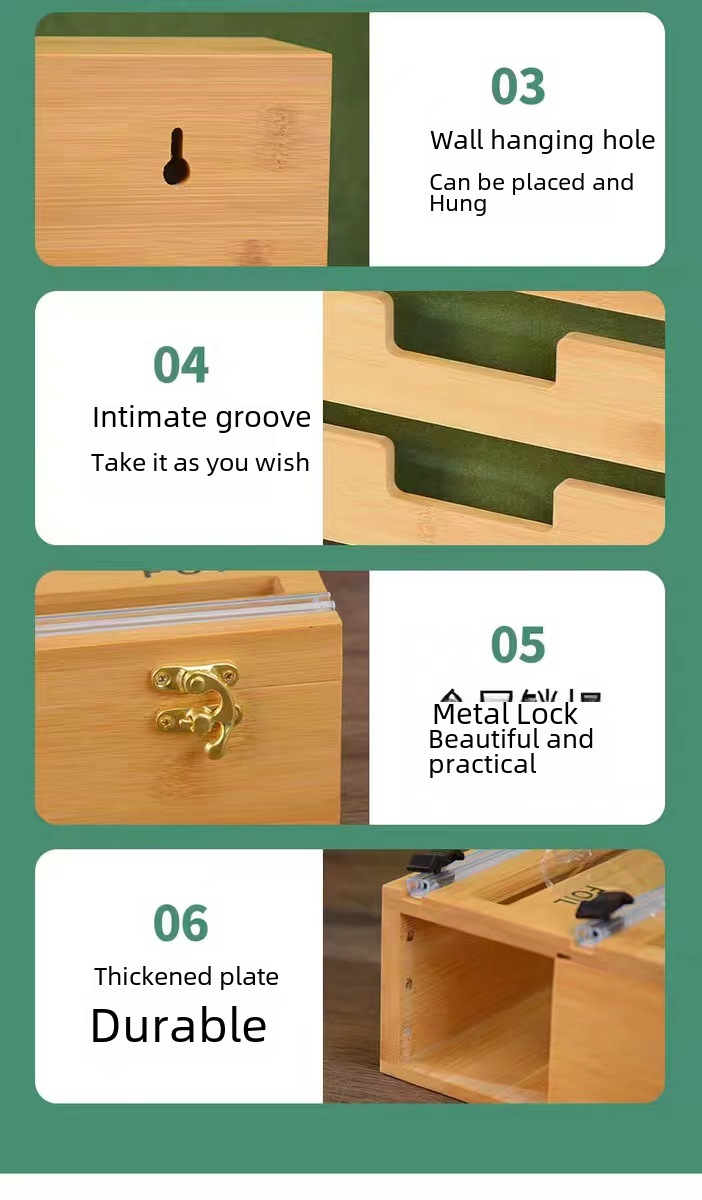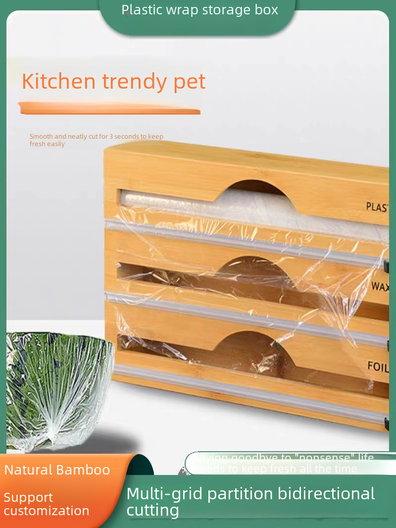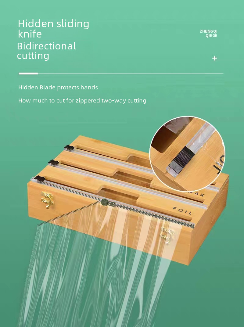 Simple wall mounted bamboo kitchen tin foil storage box hidden knife two way Plastic Wrap cutter commercial