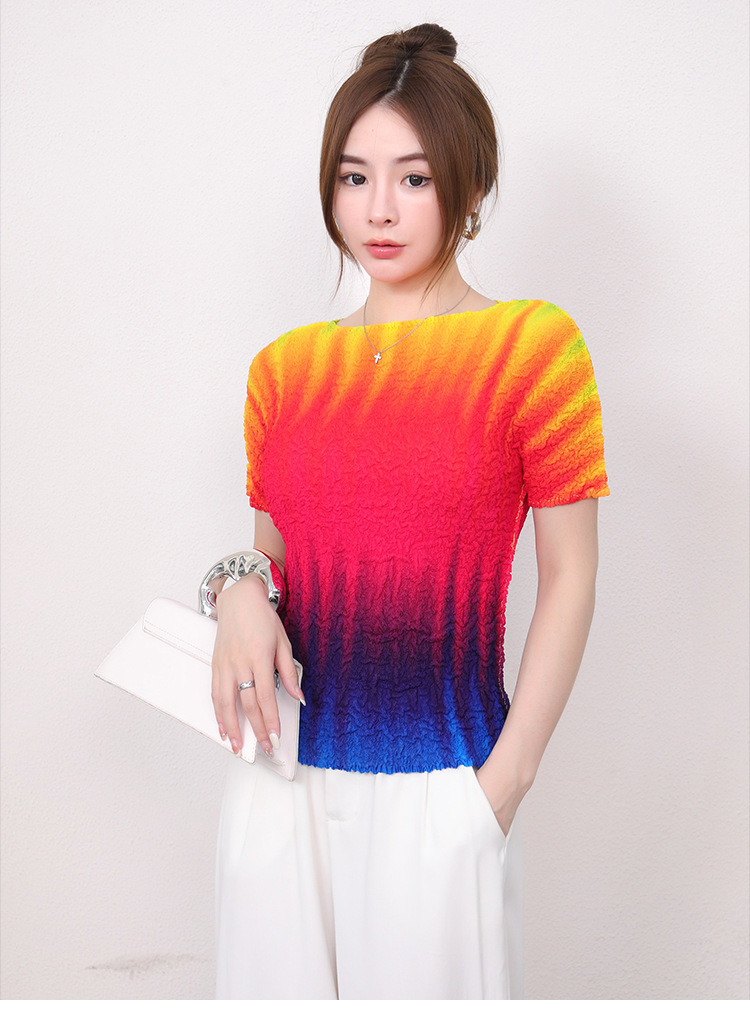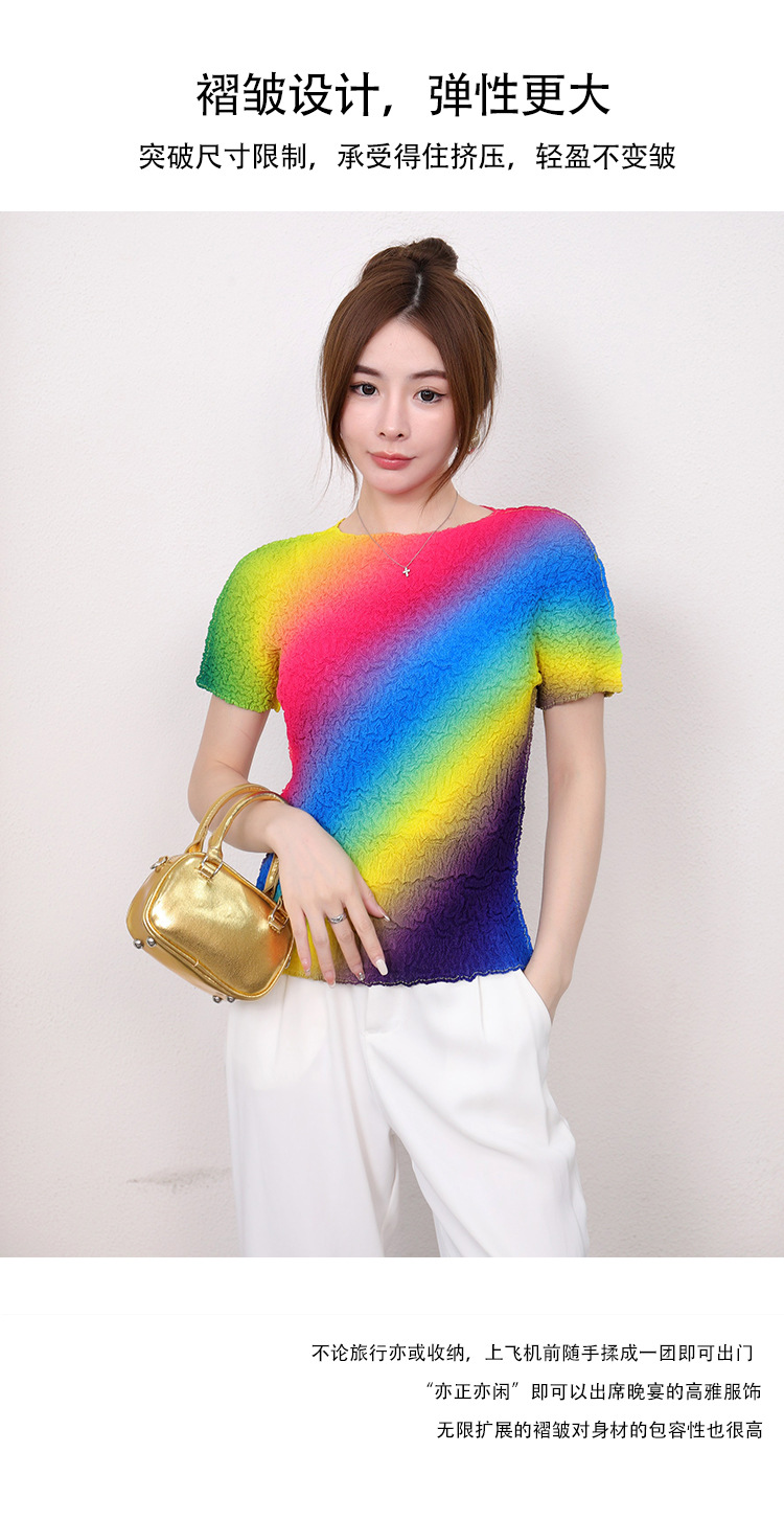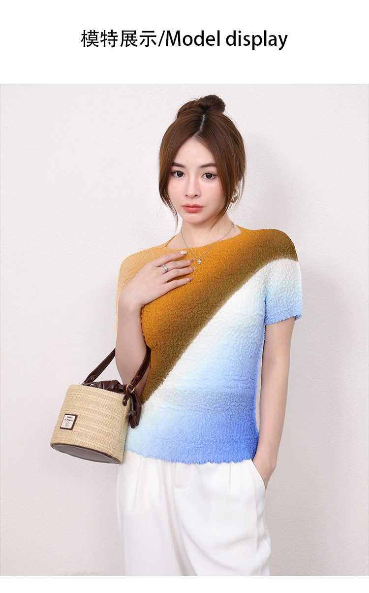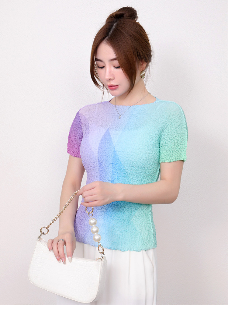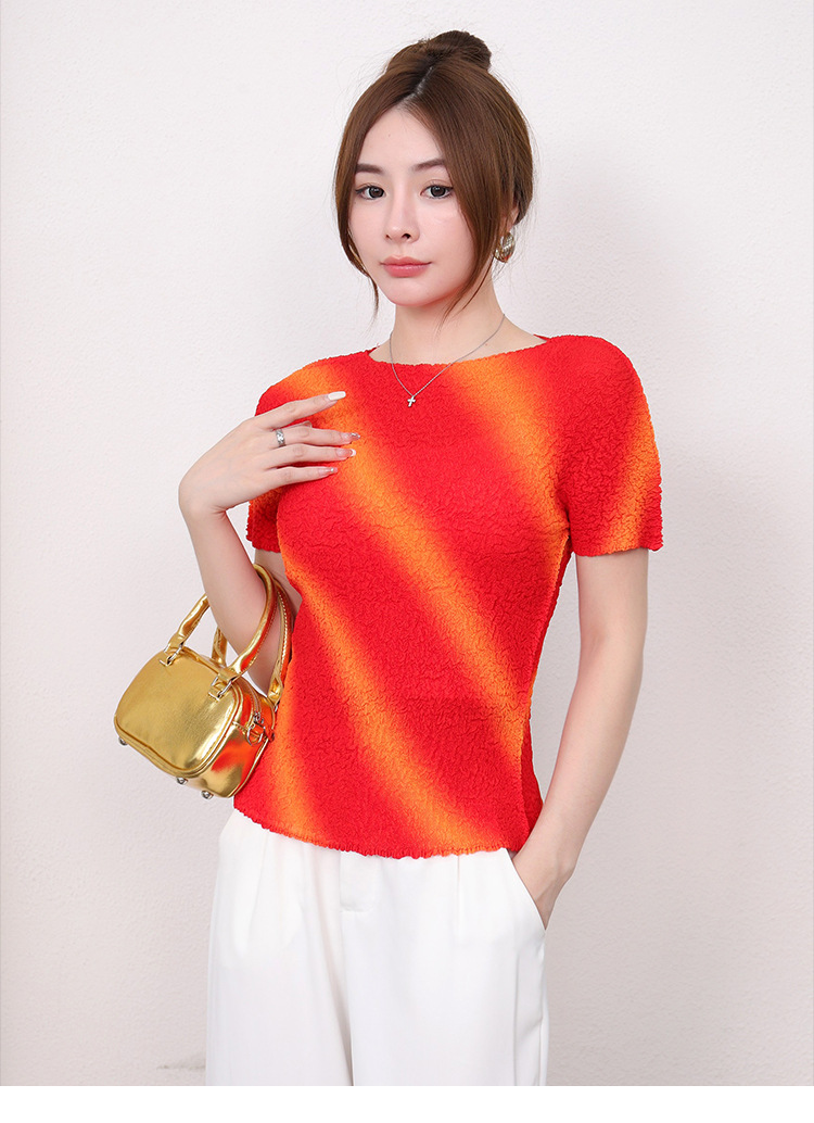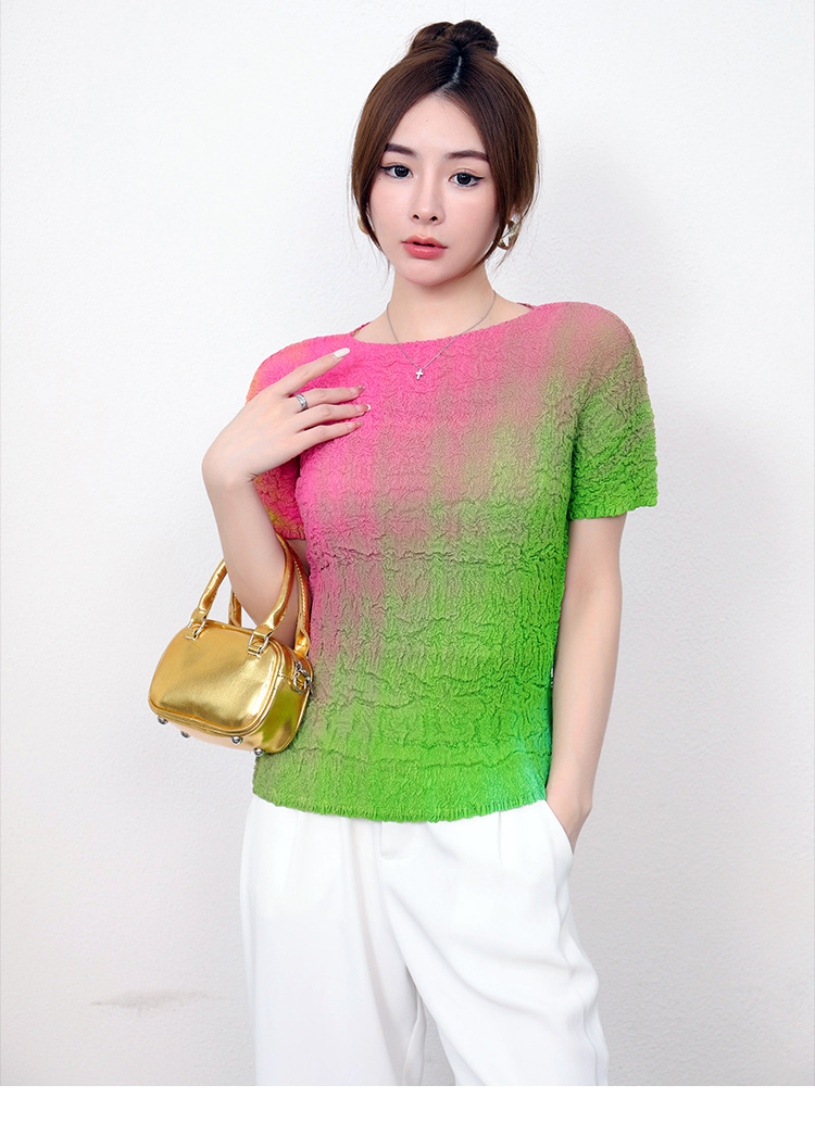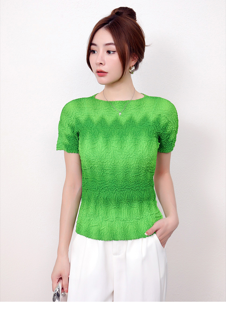 Slimming Meat Covering Top Women s 2024 Summer Women s Design Sense T Shirt Short Sleeved Gradient Base Shirt Miyake Pleated Top
