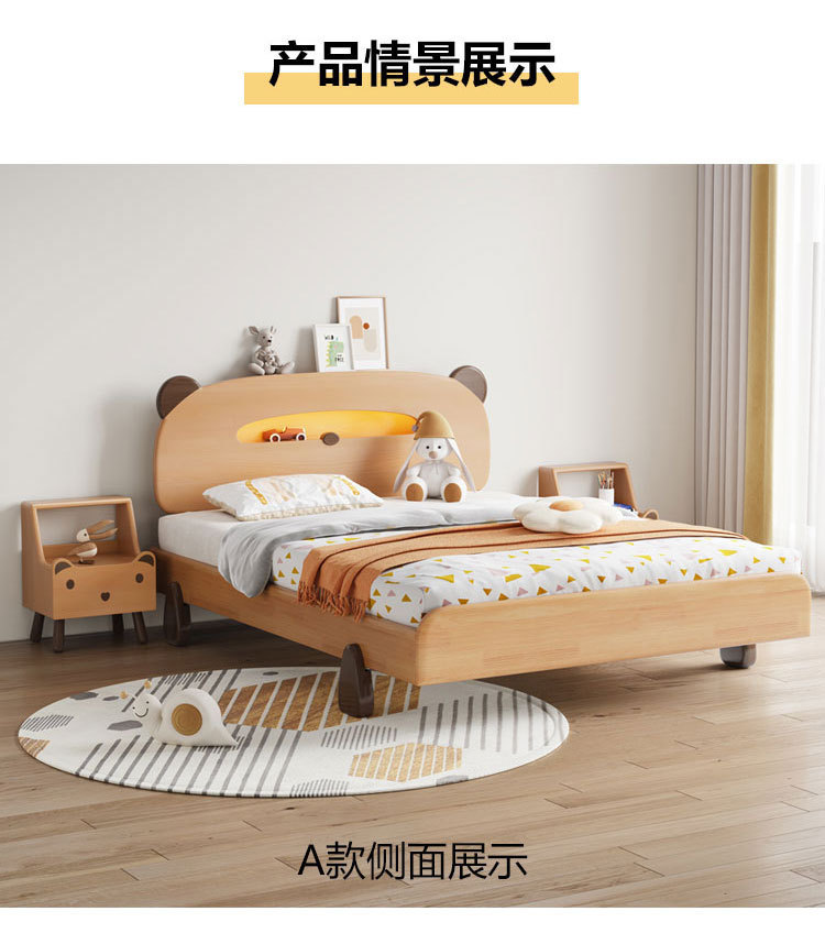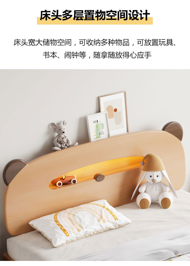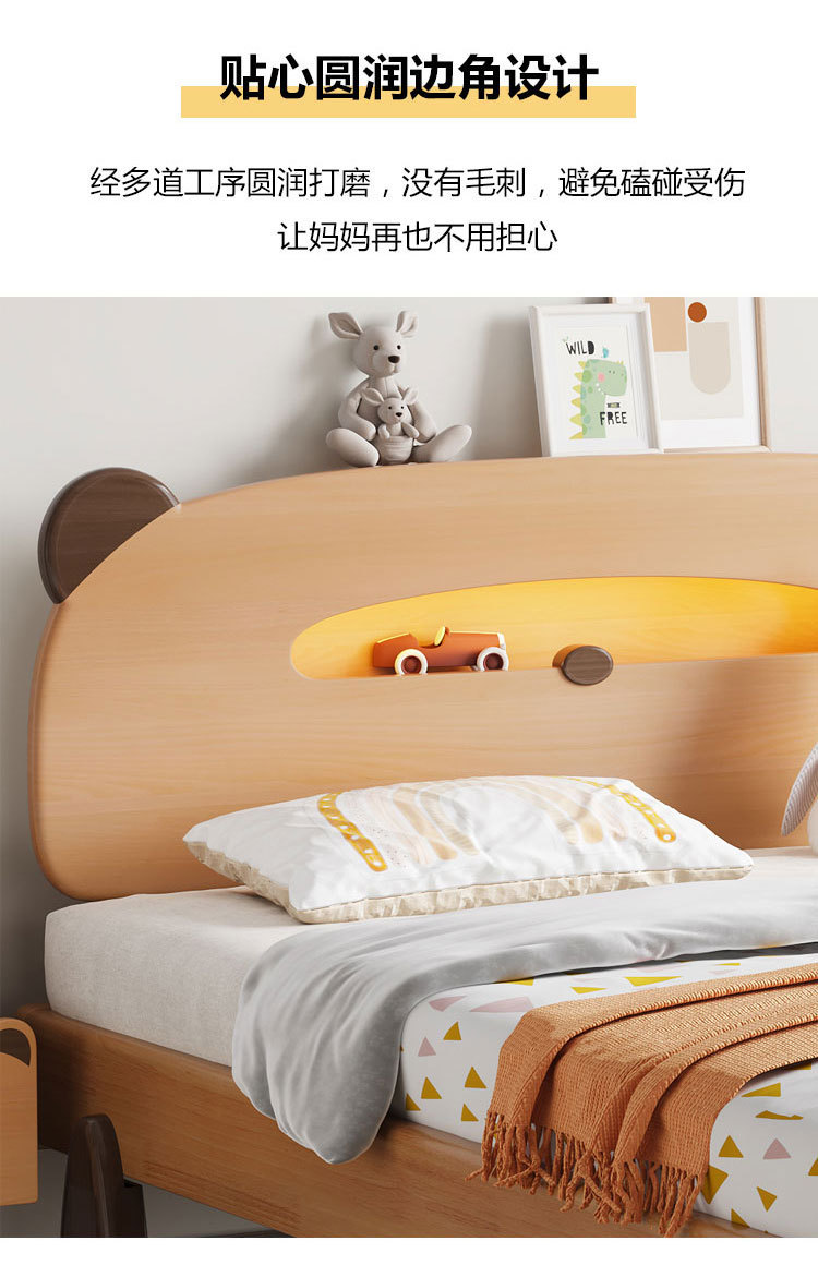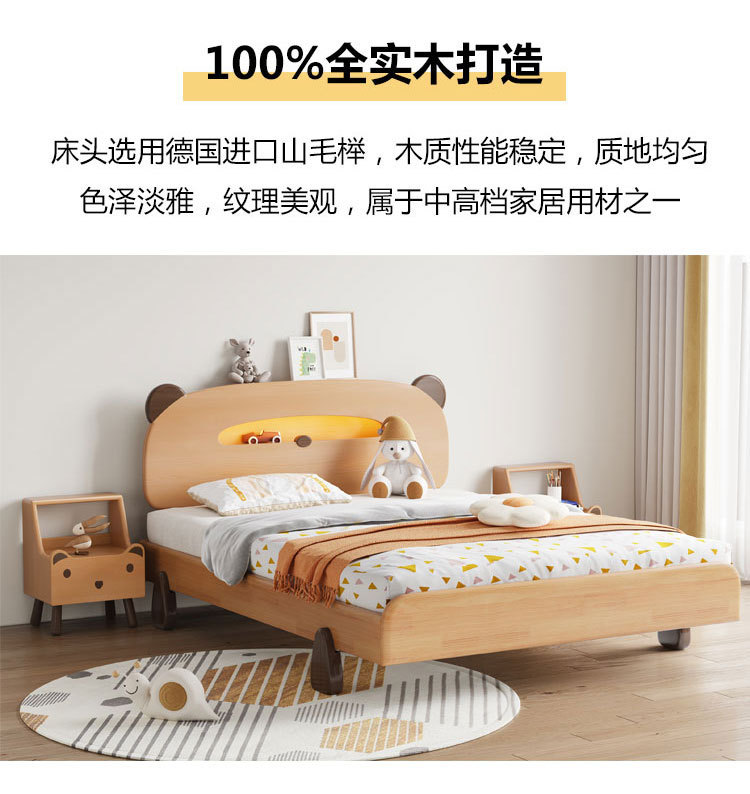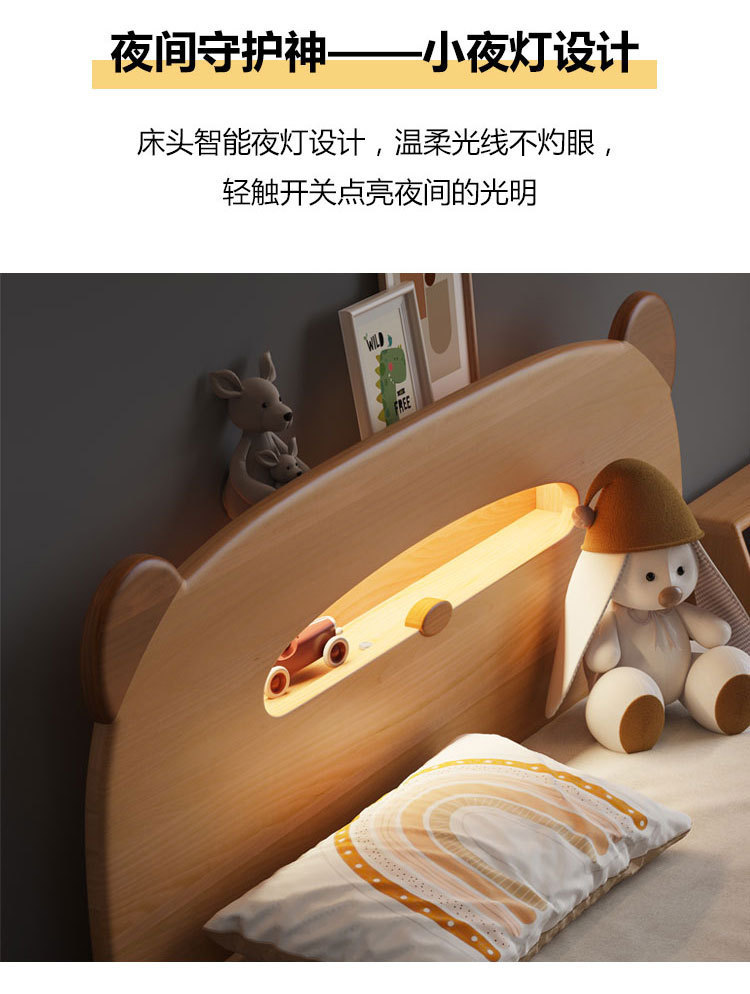 Solid wood modern simple wood color bear night light storage bed small apartment 1.5 m children s drop resistant fence bed