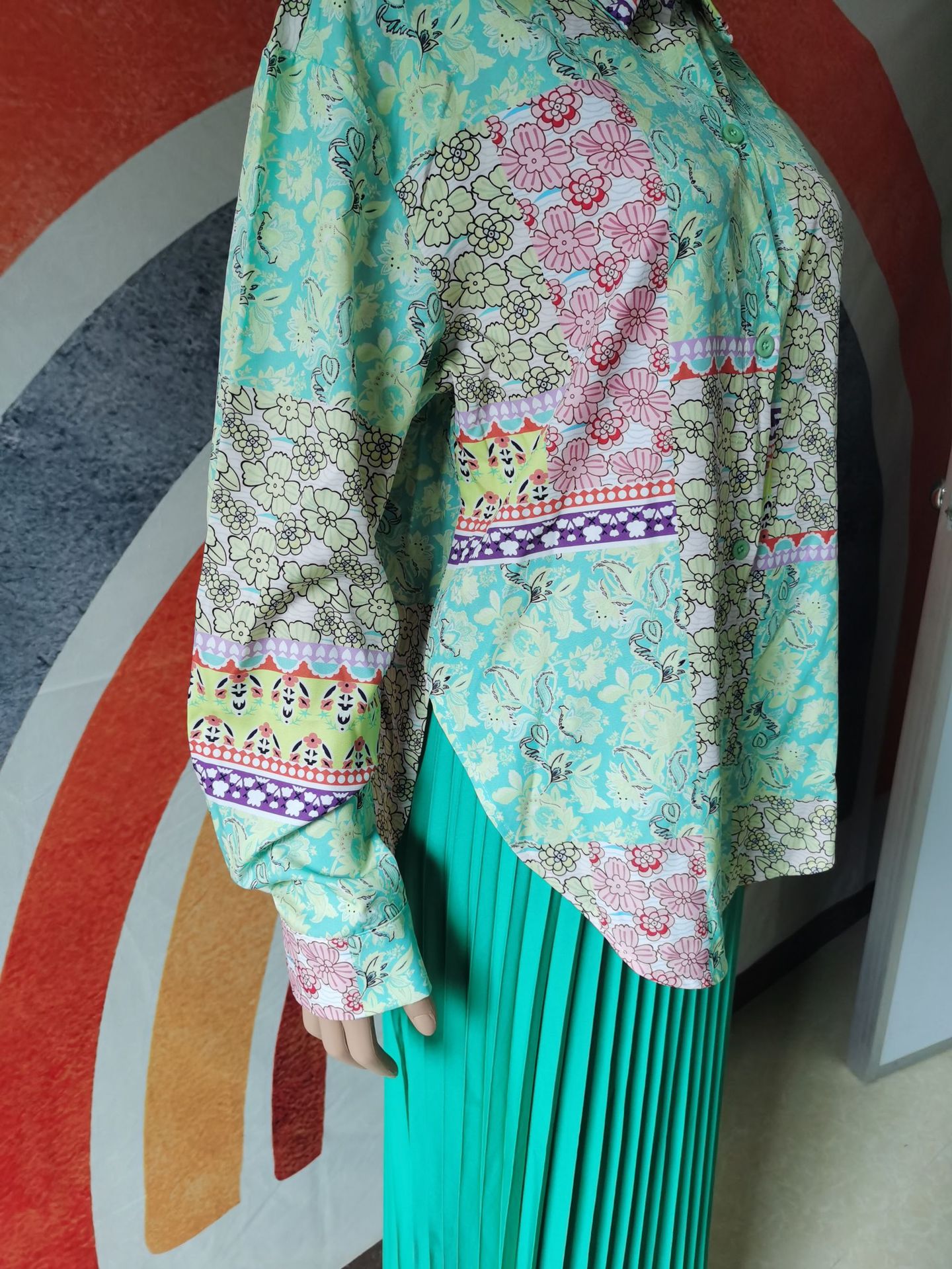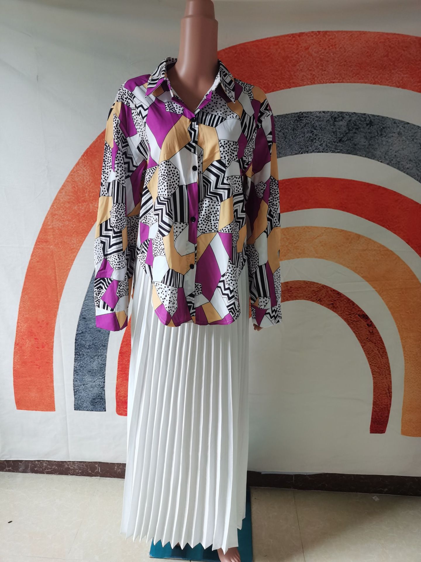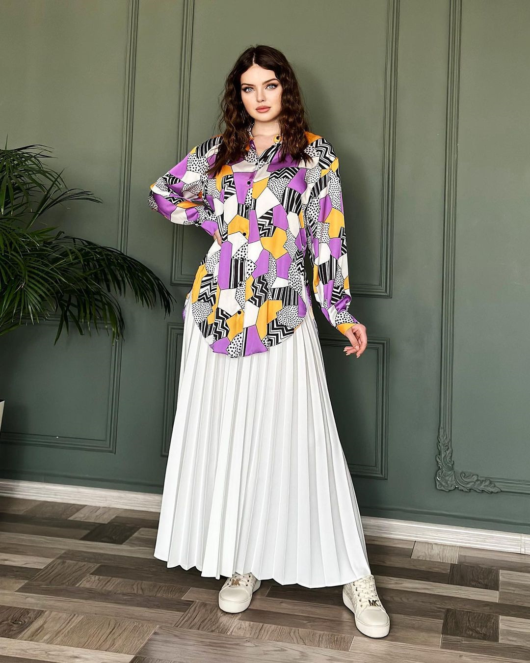 Spot Middle East Muslim Women s 2024 Spring New Loose Long Sleeve Printed Shirt Pleated Skirt Set