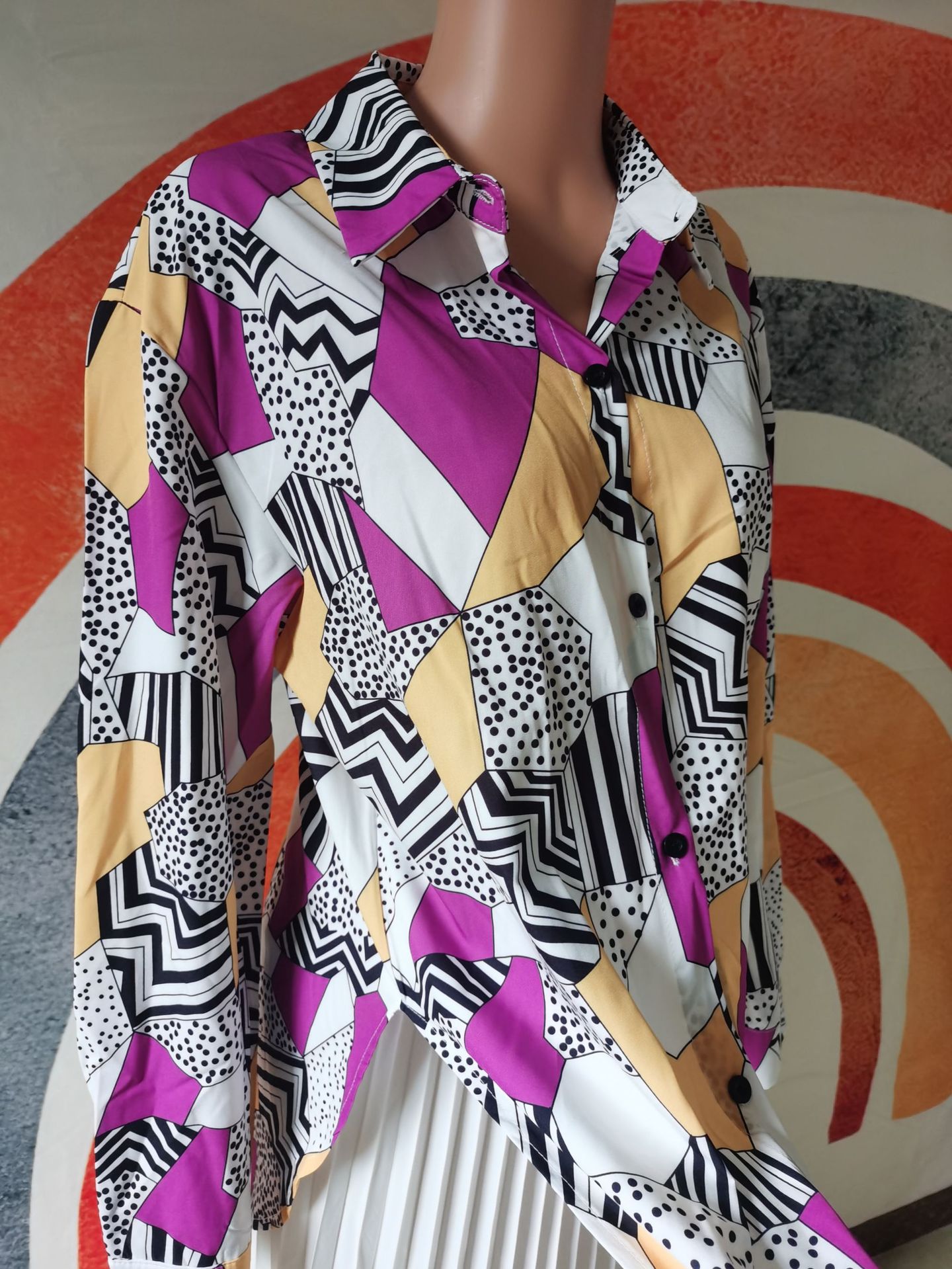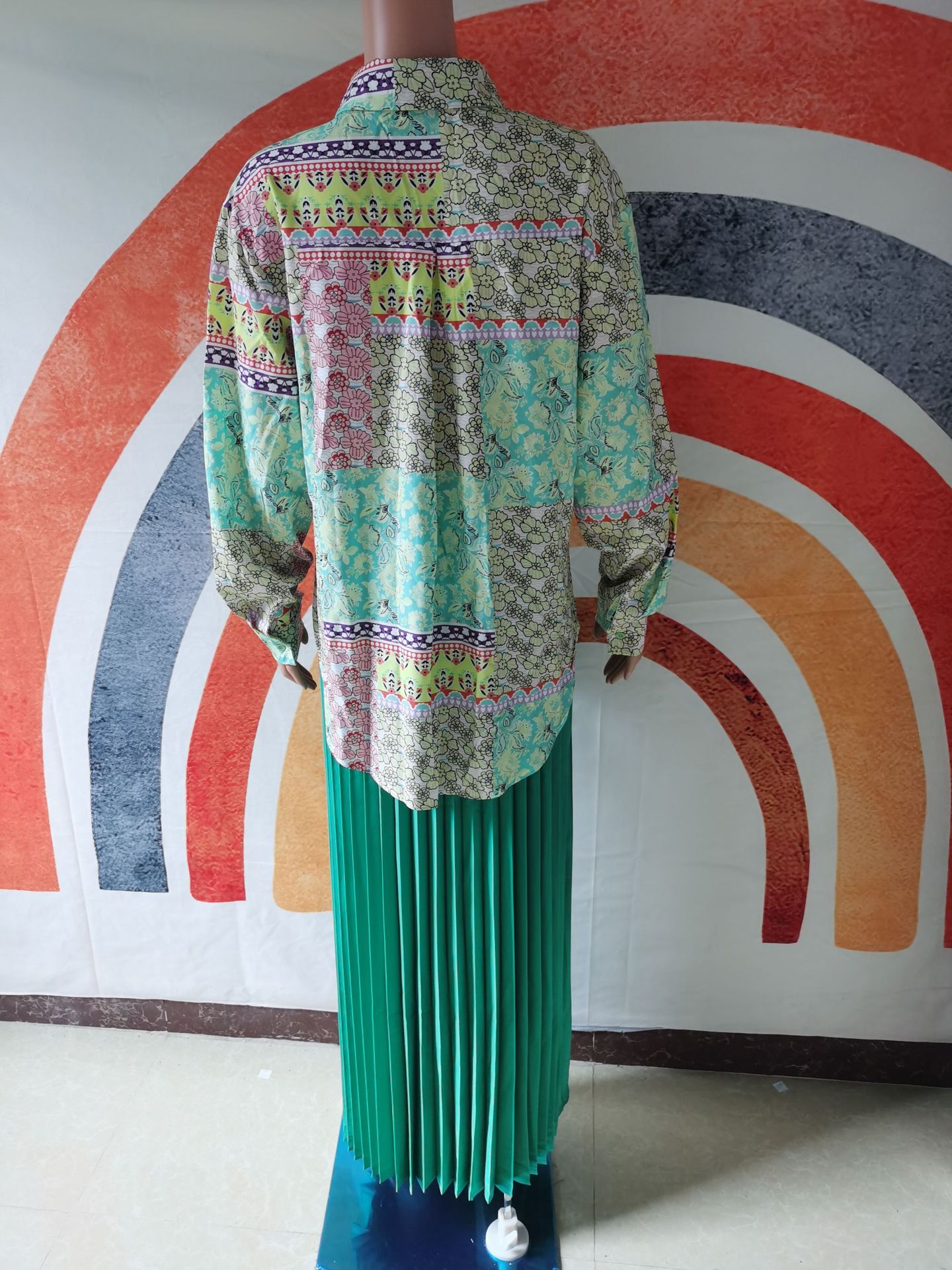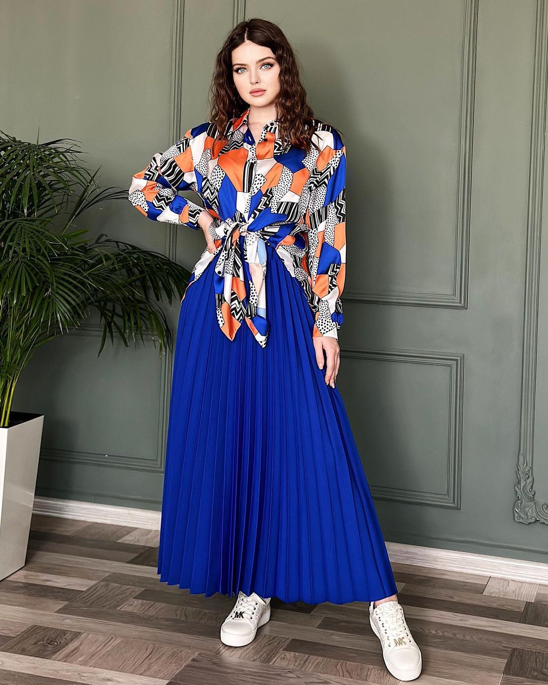 Spot Middle East Muslim Women s 2024 Spring New Loose Long Sleeve Printed Shirt Pleated Skirt Set