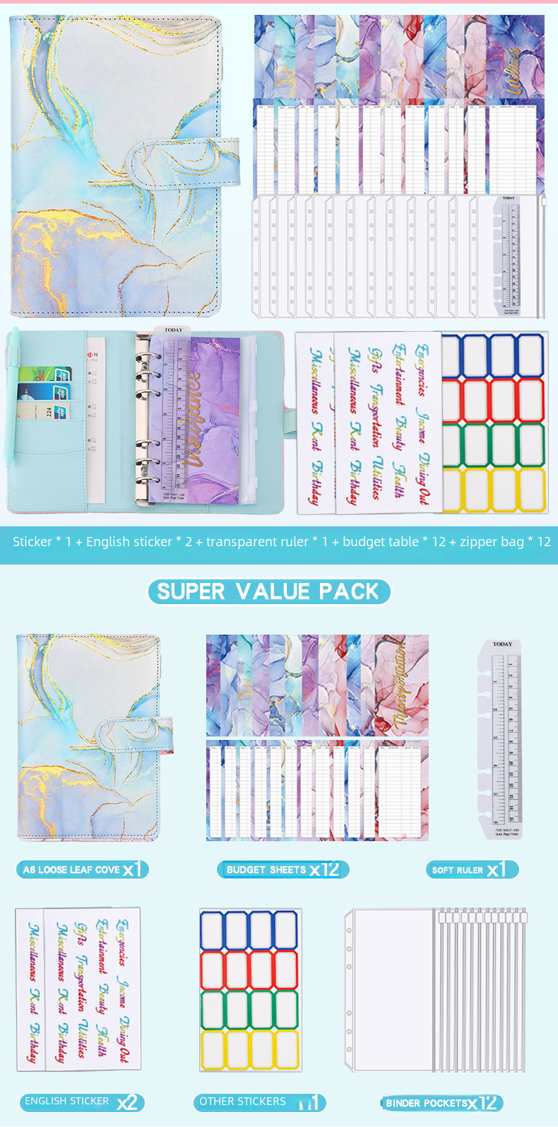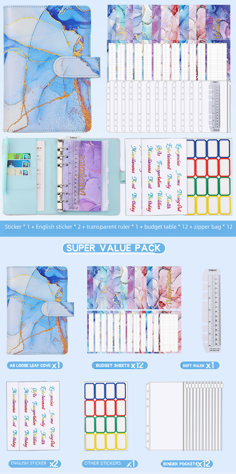 - Colored Marble/light blue (marble budget card 12 + zipper bag 12 + ruler + gradient color English 2+16 color sticker 1)