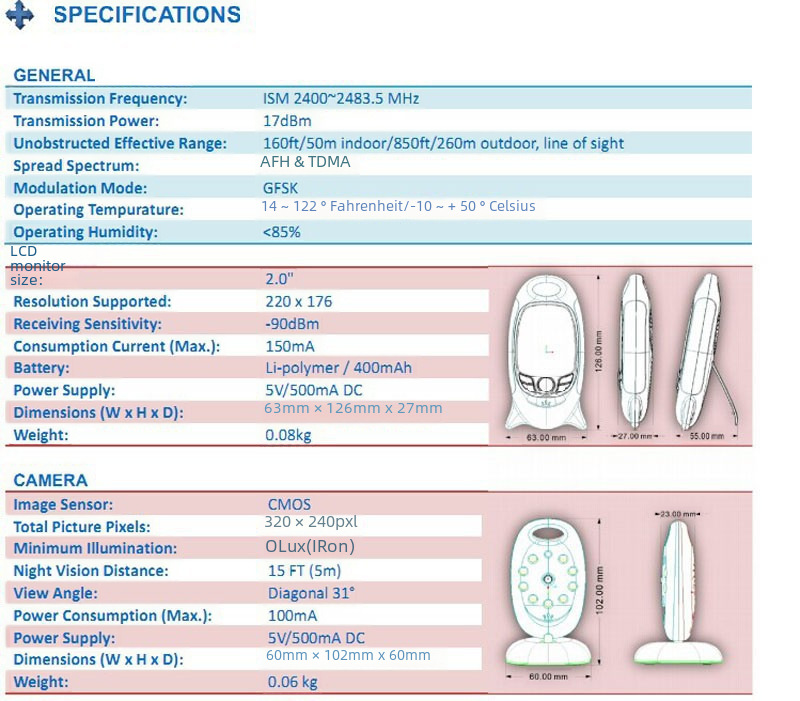 Wide Temperature Range:Operating in an environmental temperature of -10 to 50℃, this baby monitor is versatile and can function in various environments.