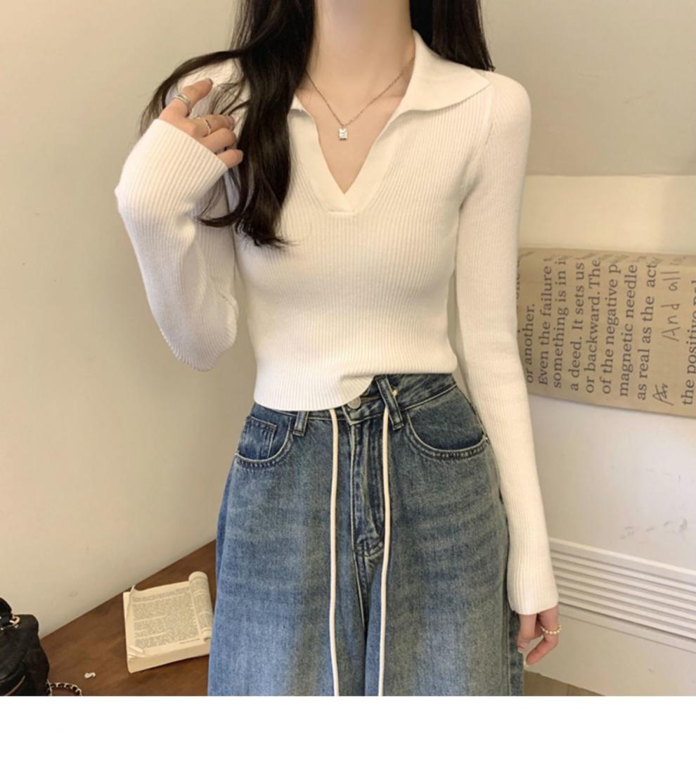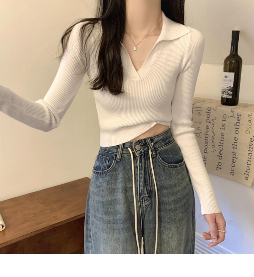 Women s V neck sweater 2024 autumn and winter new slim fit short navel exposed inner top long sleeved sweater bottoming shirt