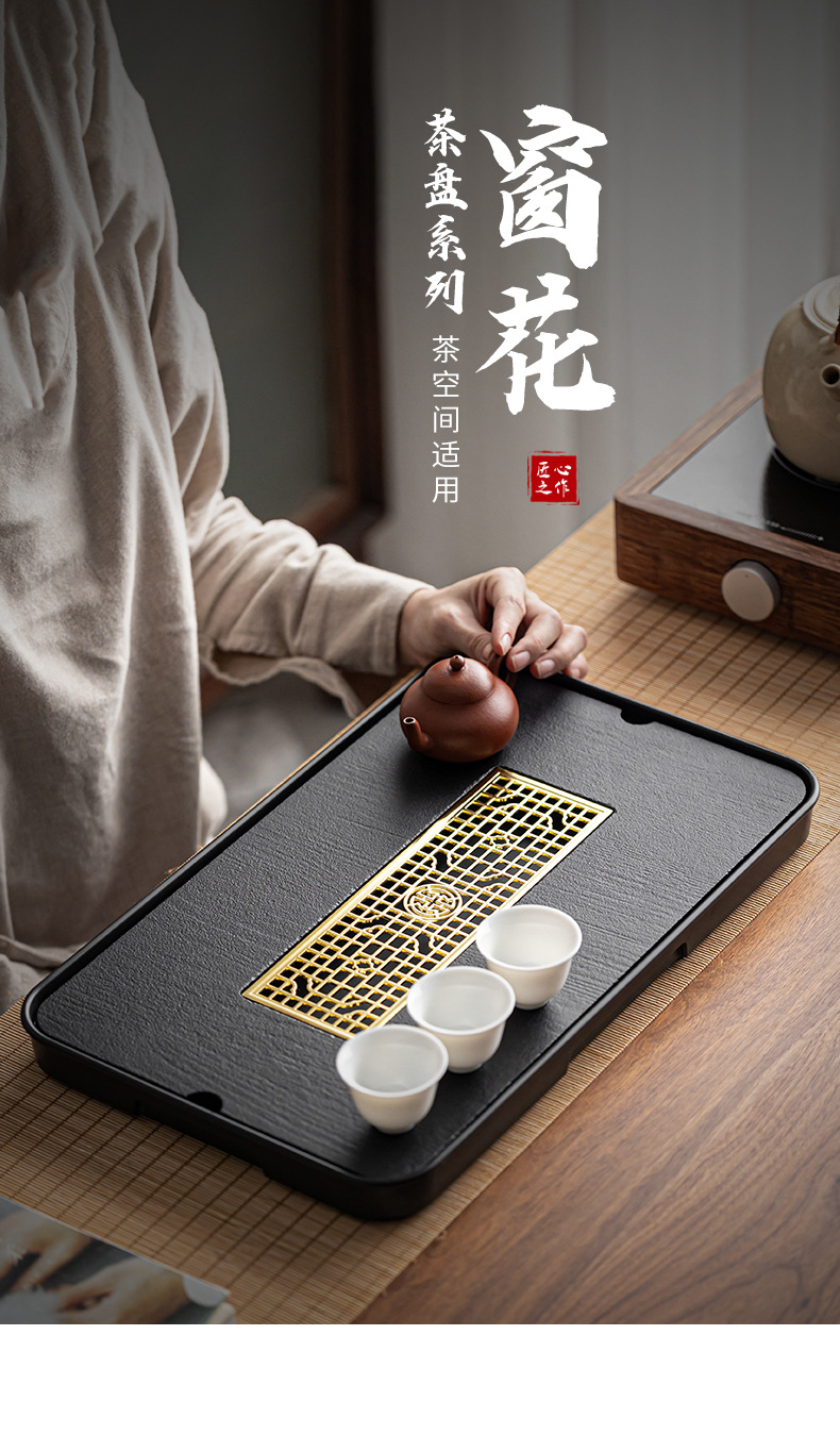 - (Small) Ancient Window Black Rectangular Imitation Wujin Tea Tray 37_24 [Water Delivery Drain Pipe Drain Ball]]
