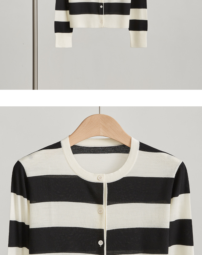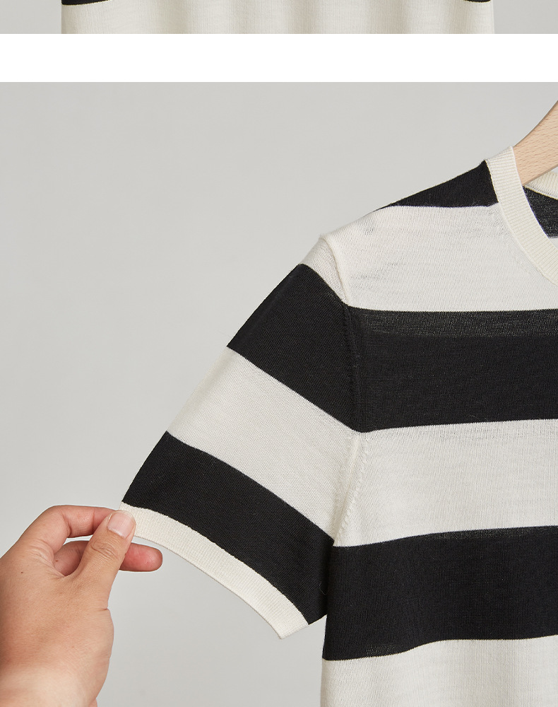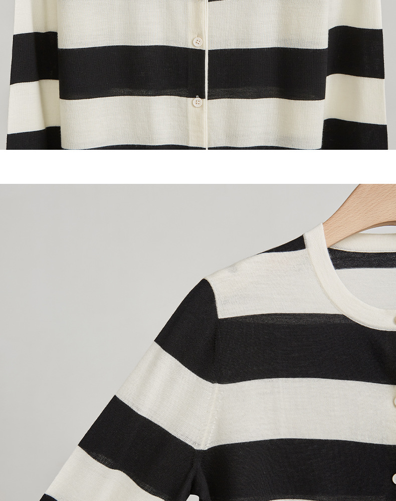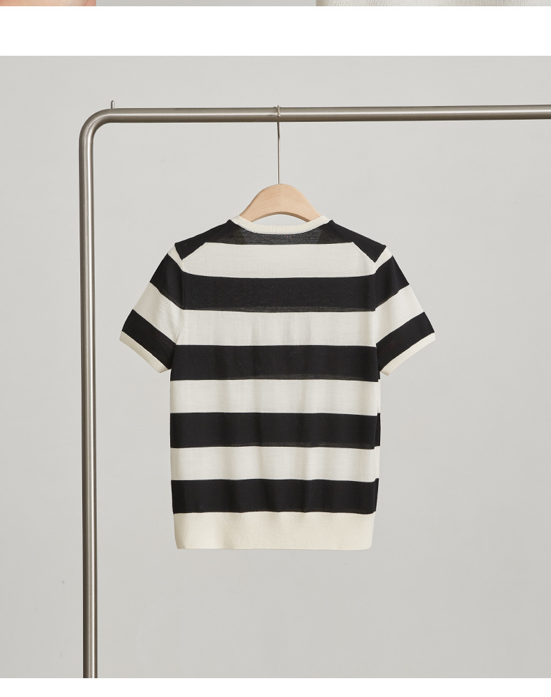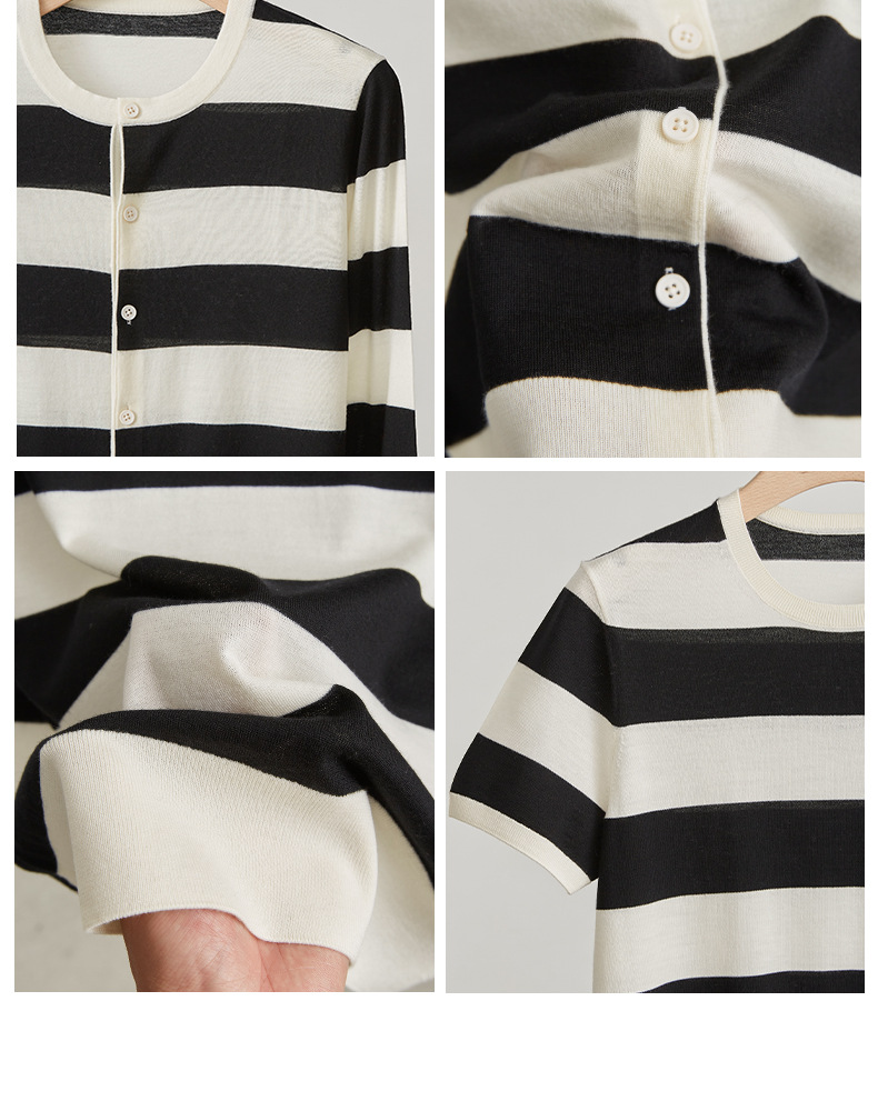 Xinao 100 wool knitted cardigan women s black and white contrast color striped short sleeve elegant temperament casual loose top