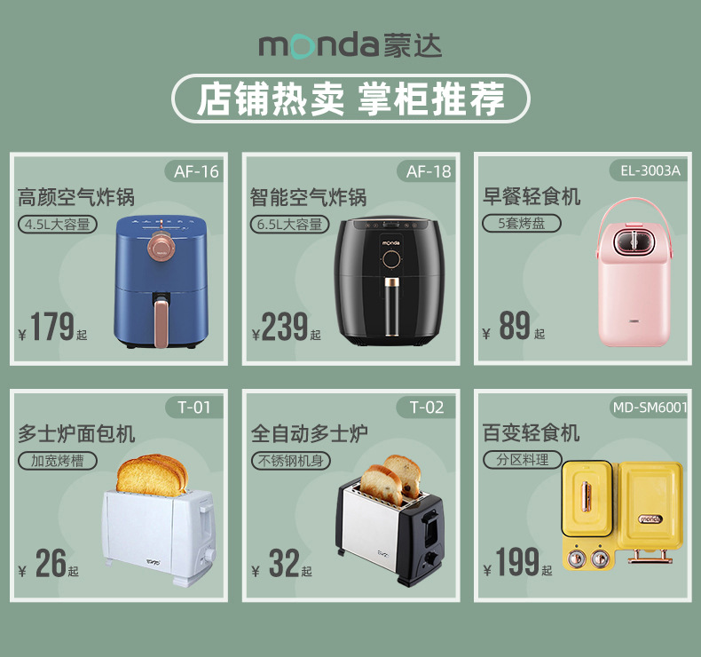 关于我们:慈溪市蒙达电器主要经营:空气炸锅、原汁机、多士炉、薄饼机、三明治机、水壶等各类厨房小家电、生活电器的厂家,旗下有:蒙达、MONDA、MONDIAL等品牌,产品通过国家3c认证,CE,GS等认证,坚持以“让客户满意,为客户赢利”为服务宗旨,可提供OEM/ODM服务、团购、礼品、亚马逊,支持一件代发、出口贸易,欢迎来我公司参观与洽谈